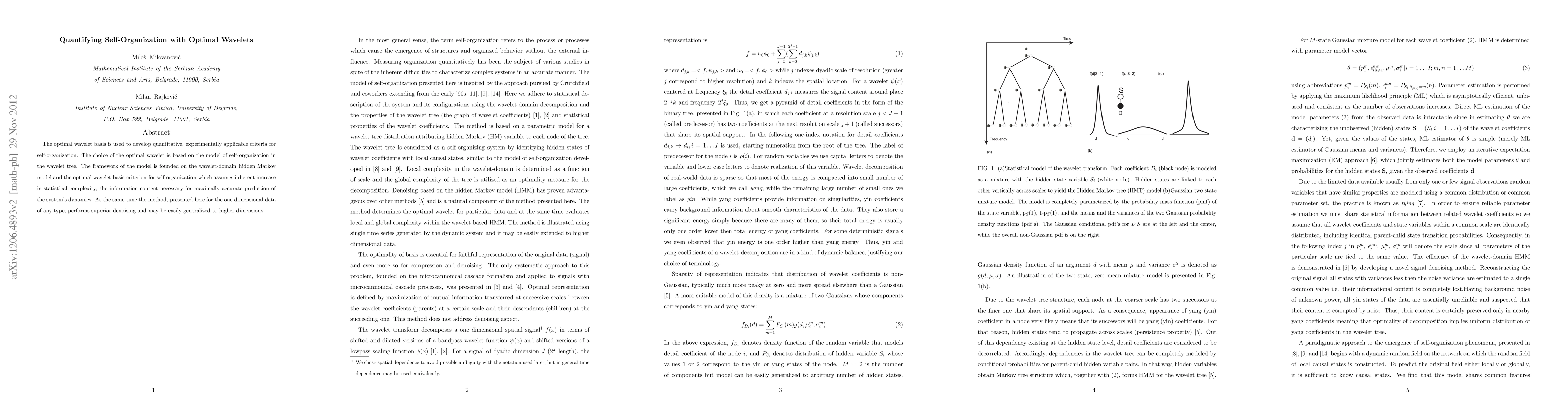The optimal wavelet basis is used to develop quantitative, experimentally applicable criteria for self-organization. The choice of the optimal wavelet is based on the model of self-organization in the wavelet tree. The framework of the model is founded on the wavelet-domain hidden Markov model and the optimal wavelet basis criterion for self-organization which assumes inherent increase in statistical complexity, the information content necessary for maximally accurate prediction of the system's dynamics. At the same time the method, presented here for the one-dimensional data of any type, performs superior denoising and may be easily generalized to higher dimensions.
