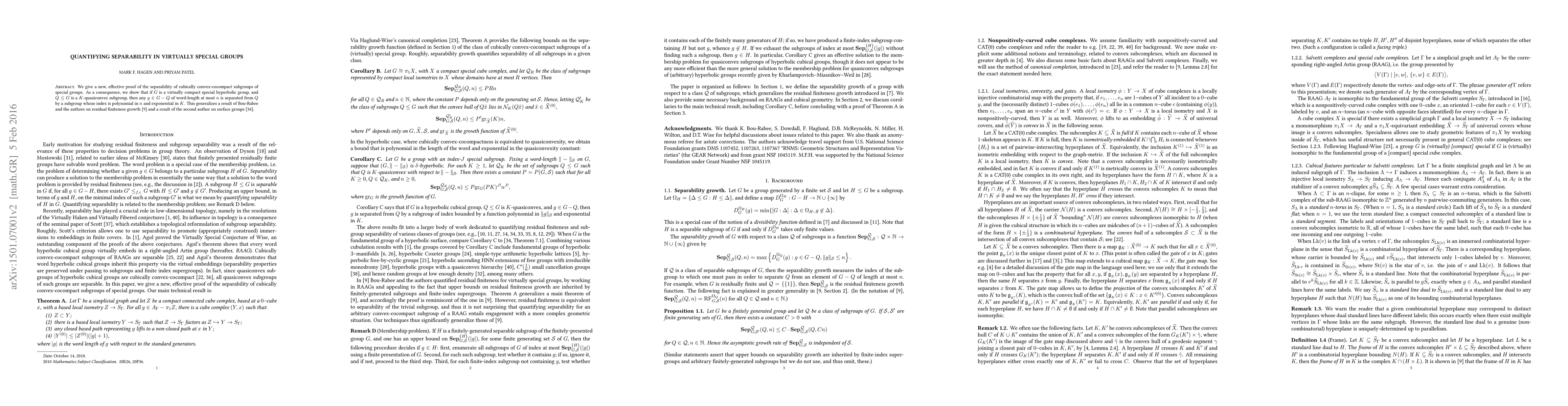 The paper provides an effective proof of the separability of cubically convex-cocompact subgroups of special groups, utilizing concepts from nonpositively curved cube complexes, right-angled Coxeter groups (RAAGs), and Salvetti complexes.
