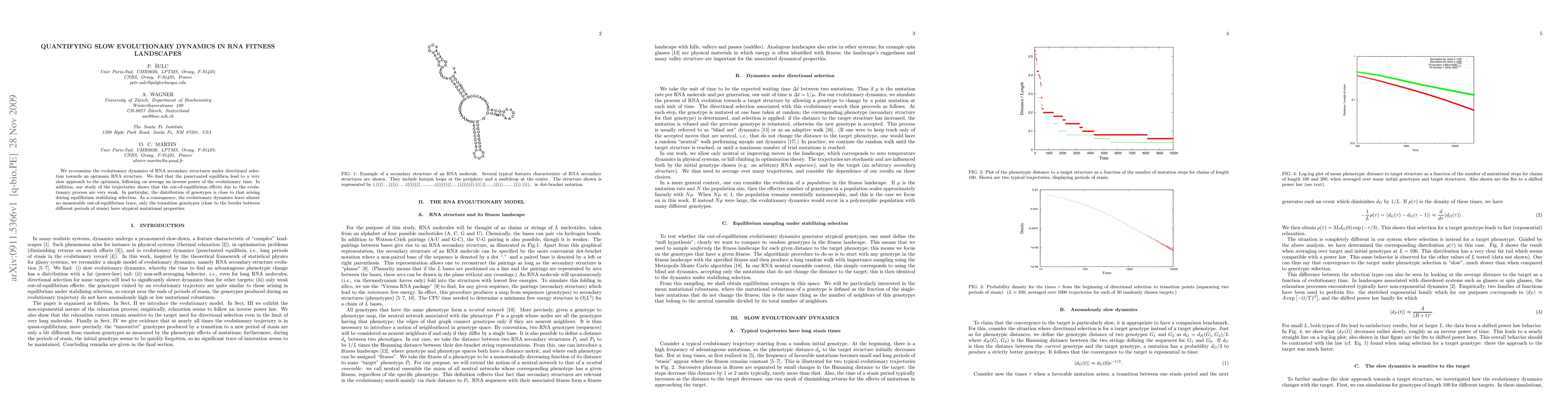 We re-examine the evolutionary dynamics of RNA secondary structures under directional selection towards an optimum RNA structure. We find that the punctuated equilibria lead to a very slow approach to the optimum, following on average an inverse power of the evolutionary time. In addition, our study of the trajectories shows that the out-of-equilibrium effects due to the evolutionary process are very weak. In particular, the distribution of genotypes is close to that arising during equilibrium stabilizing selection. As a consequence, the evolutionary dynamics leave almost no measurable out-of-equilibrium trace, only the transition genotypes (close to the border between different periods of stasis) have atypical mutational properties.