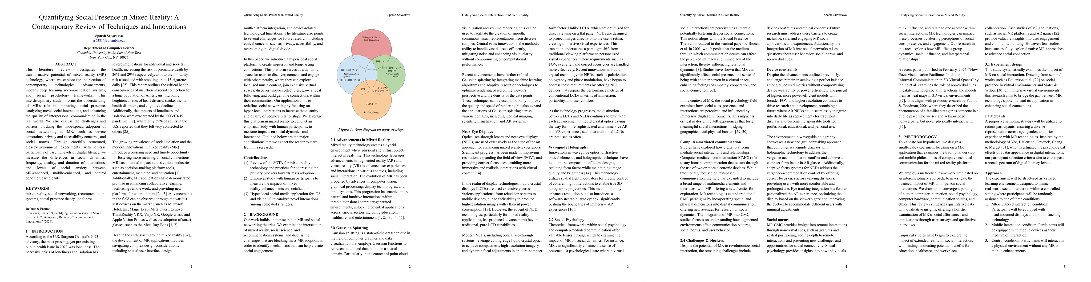 This review assesses contemporary techniques and innovations enhancing social presence in mixed reality (MR), focusing on deep learning and social psychology to improve interpersonal communication. It identifies barriers like device limitations and privacy concerns that hinder MR's adoption, and evaluates social interaction metrics via controlled experiments with participants of varying digital literacy.