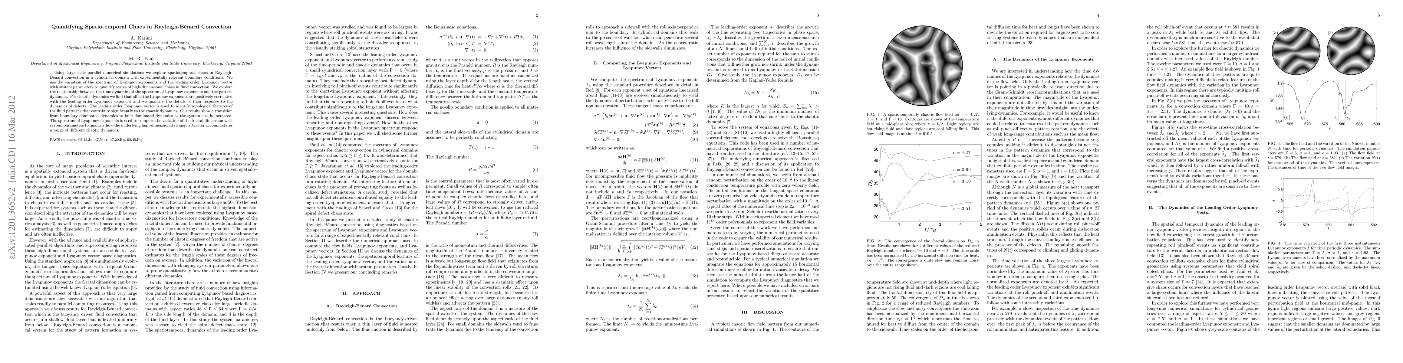 This paper uses numerical simulations to quantify spatiotemporal chaos in Rayleigh-Bénard convection, employing Lyapunov exponents and vectors to analyze chaotic dynamics and transitions in fluid patterns. The study reveals a shift from boundary to bulk dynamics as system size increases, and uses fractal dimension variation to quantify the strange attractor accommodating different chaotic states.