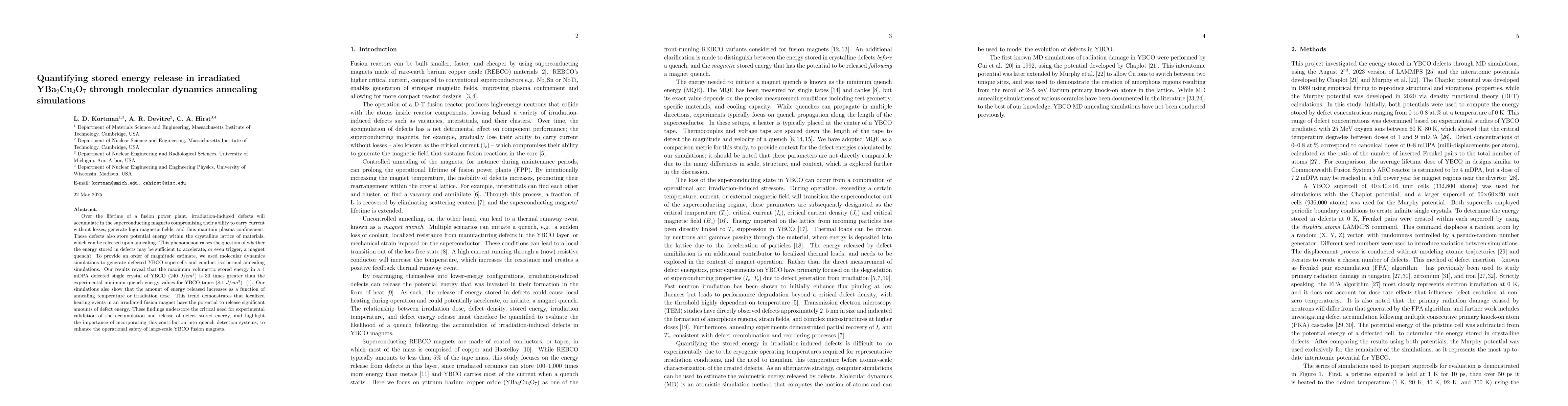 Over the lifetime of a fusion power plant, irradiation-induced defects will accumulate in the superconducting magnets compromising their ability to carry current without losses, generate high magnetic fields, and thus maintain plasma confinement. These defects also store potential energy within the crystalline lattice of materials, which can be released upon annealing. This phenomenon raises the question of whether the energy stored in defects may be sufficient to accelerate, or even trigger, a magnet quench? To provide an order of magnitude estimate, we used molecular dynamics simulations to generate defected YBCO supercells and conduct isothermal annealing simulations. Our results reveal that the maximum volumetric stored energy in a 4 mDPA defected single crystal of YBCO (240 $J/cm^3$) is 30 times greater than the experimental minimum quench energy values for YBCO tapes (8.1 $J/cm^3$). Our simulations also show that the amount of energy released increases as a function of annealing temperature or irradiation dose. This trend demonstrates that localized heating events in an irradiated fusion magnet have the potential to release significant amounts of defect energy. These findings underscore the critical need for experimental validation of the accumulation and release of defect stored energy, and highlight the importance of incorporating this contribution into quench detection systems, to enhance the operational safety of large-scale YBCO fusion magnets.