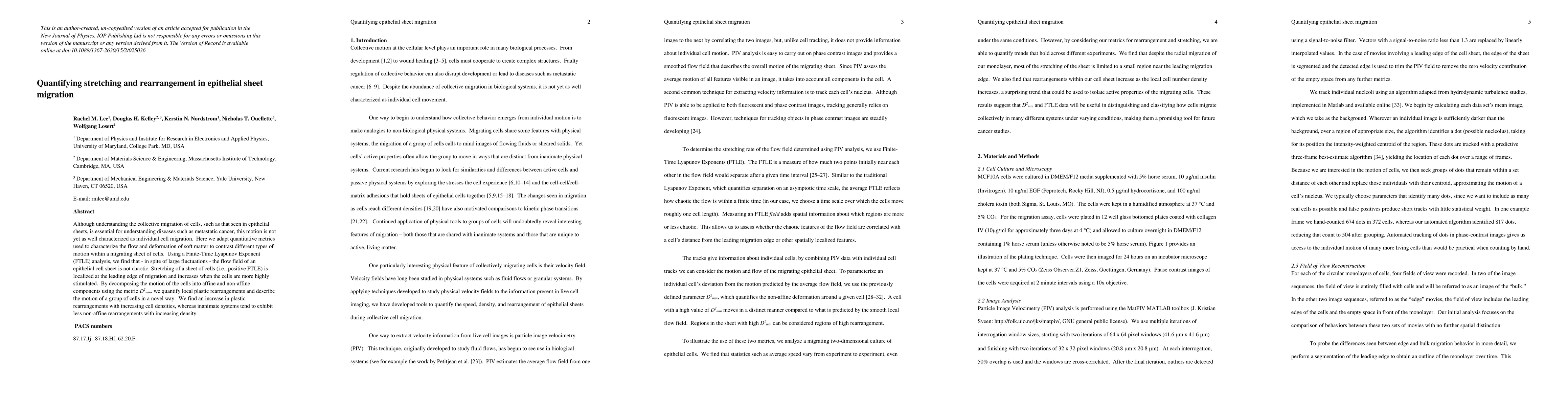 This paper uses quantitative metrics to analyze the collective migration of epithelial cells, finding that despite fluctuations, the migration flow is non-chaotic with localized stretching at the leading edge. It also quantifies plastic rearrangements in cell groups, revealing increased rearrangements with higher cell densities, contrasting with inanimate systems.