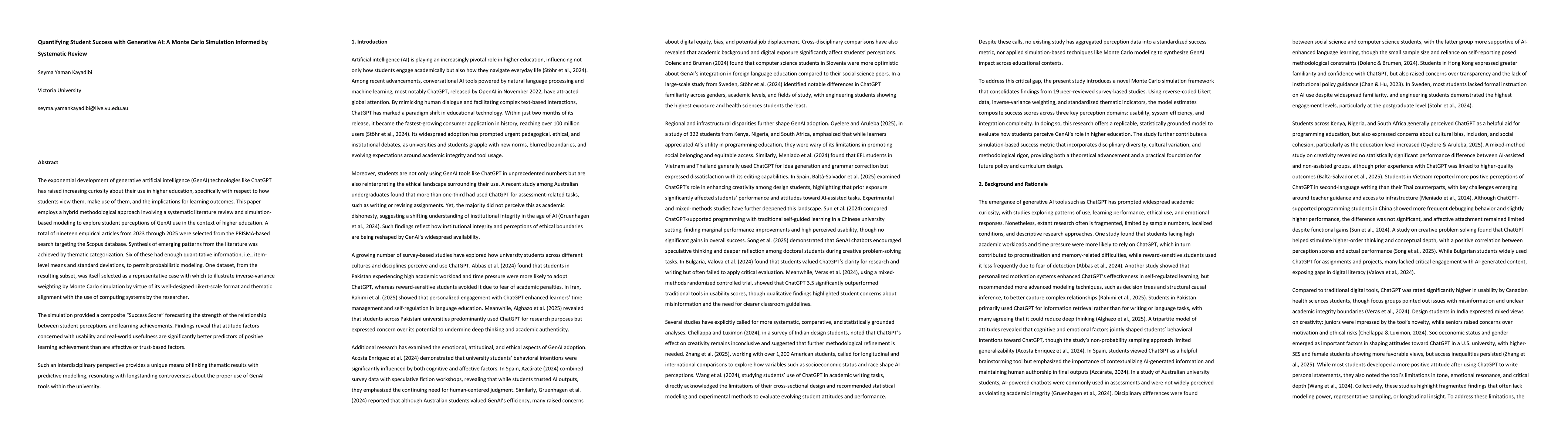 The exponential development of generative artificial intelligence (GenAI) technologies like ChatGPT has raised increasing curiosity about their use in higher education, specifically with respect to how students view them, make use of them, and the implications for learning outcomes. This paper employs a hybrid methodological approach involving a systematic literature review and simulation-based modeling to explore student perceptions of GenAI use in the context of higher education. A total of nineteen empirical articles from 2023 through 2025 were selected from the PRISMA-based search targeting the Scopus database. Synthesis of emerging patterns from the literature was achieved by thematic categorization. Six of these had enough quantitative information, i.e., item-level means and standard deviations, to permit probabilistic modeling. One dataset, from the resulting subset, was itself selected as a representative case with which to illustrate inverse-variance weighting by Monte Carlo simulation, by virtue of its well-designed Likert scale format and thematic alignment with the use of computing systems by the researcher. The simulation provided a composite "Success Score" forecasting the strength of the relationship between student perceptions and learning achievements. Findings reveal that attitude factors concerned with usability and real-world usefulness are significantly better predictors of positive learning achievement than affective or trust-based factors. Such an interdisciplinary perspective provides a unique means of linking thematic results with predictive modelling, resonating with longstanding controversies about the proper use of GenAI tools within the university.