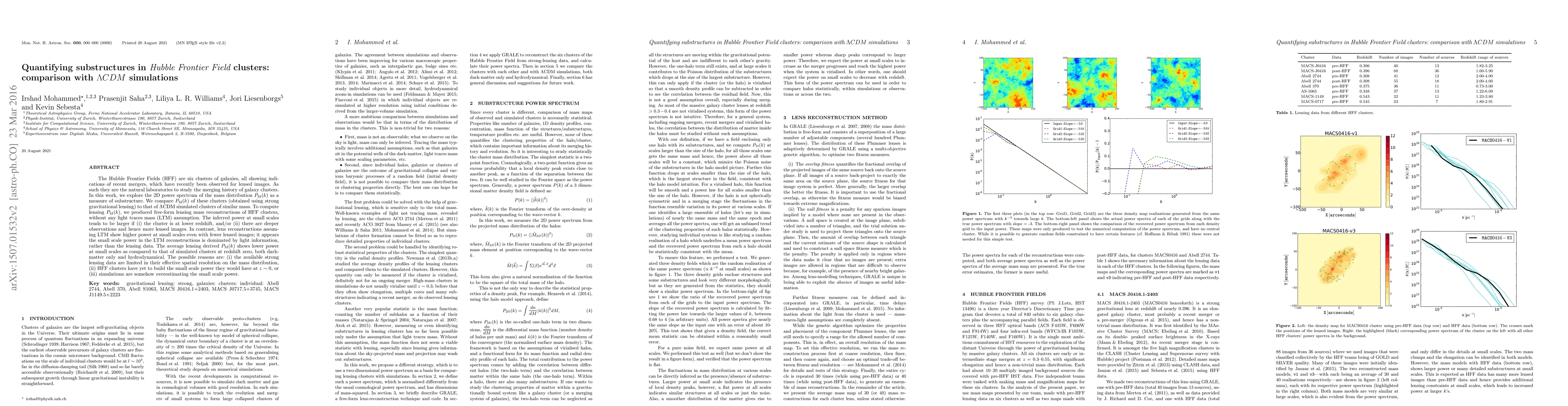 The Hubble Frontier Fields (HFF) are six clusters of galaxies, all showing indications of recent mergers, which have recently been observed for lensed images. As such they are the natural laboratories to study the merging history of galaxy clusters. In this work, we explore the 2D power spectrum of the mass distribution $P_{\rm M}(k)$ as a measure of substructure. We compare $P_{\rm M}(k)$ of these clusters (obtained using strong gravitational lensing) to that of $\Lambda$CDM simulated clusters of similar mass. To compute lensing $P_{\rm M}(k)$, we produced free-form lensing mass reconstructions of HFF clusters, without any light traces mass (LTM) assumption. The inferred power at small scales tends to be larger if (i)~the cluster is at lower redshift, and/or (ii)~there are deeper observations and hence more lensed images. In contrast, lens reconstructions assuming LTM show higher power at small scales even with fewer lensed images; it appears the small scale power in the LTM reconstructions is dominated by light information, rather than the lensing data. The average lensing derived $P_{\rm M}(k)$ shows lower power at small scales as compared to that of simulated clusters at redshift zero, both dark-matter only and hydrodynamical. The possible reasons are: (i)~the available strong lensing data are limited in their effective spatial resolution on the mass distribution, (ii)~HFF clusters have yet to build the small scale power they would have at $z\sim 0$, or (iii)~simulations are somehow overestimating the small scale power.
