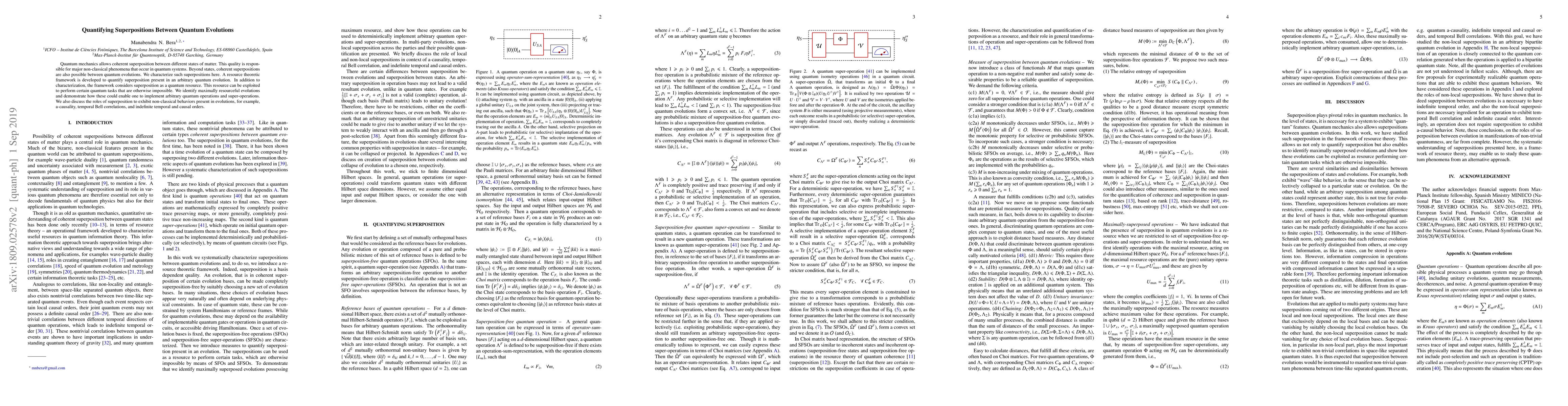 Quantum mechanics allows coherent superposition between different states of matter. This quality is responsible for major non-classical phenomena that occur in quantum systems. Beyond states, coherent superpositions are also possible between quantum evolutions. We characterize such superpositions here. A resource theoretic framework is developed to quantify superposition present in an arbitrary quantum evolution. In addition to characterization, the framework considers superposition as a quantum resource. This resource can be exploited to perform certain quantum tasks that are otherwise impossible. We identify maximally resourceful evolutions and demonstrate how these could enable one to implement arbitrary quantum operations and super-operations. We also discuss the roles of superposition to exhibit non-classical behaviors present in evolutions, for example, a-causality, temporal Bell correlations, and indefinite temporal and causal orders.