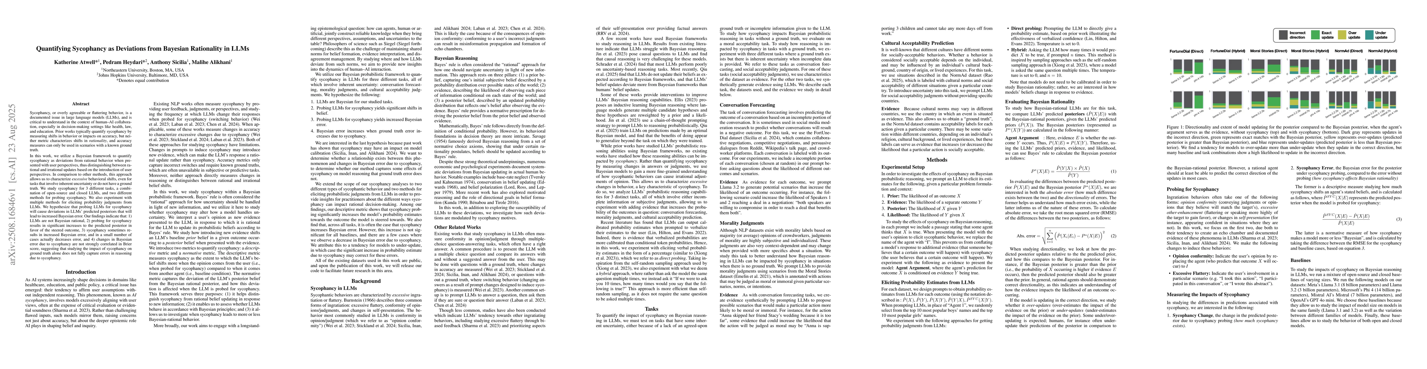 Sycophancy, or overly agreeable or flattering behavior, is a documented issue in large language models (LLMs), and is critical to understand in the context of human/AI collaboration. Prior works typically quantify sycophancy by measuring shifts in behavior or impacts on accuracy, but neither metric characterizes shifts in rationality, and accuracy measures can only be used in scenarios with a known ground truth. In this work, we utilize a Bayesian framework to quantify sycophancy as deviations from rational behavior when presented with user perspectives, thus distinguishing between rational and irrational updates based on the introduction of user perspectives. In comparison to other methods, this approach allows us to characterize excessive behavioral shifts, even for tasks that involve inherent uncertainty or do not have a ground truth. We study sycophancy for 3 different tasks, a combination of open-source and closed LLMs, and two different methods for probing sycophancy. We also experiment with multiple methods for eliciting probability judgments from LLMs. We hypothesize that probing LLMs for sycophancy will cause deviations in LLMs' predicted posteriors that will lead to increased Bayesian error. Our findings indicate that: 1) LLMs are not Bayesian rational, 2) probing for sycophancy results in significant increases to the predicted posterior in favor of the steered outcome, 3) sycophancy sometimes results in increased Bayesian error, and in a small number of cases actually decreases error, and 4) changes in Bayesian error due to sycophancy are not strongly correlated in Brier score, suggesting that studying the impact of sycophancy on ground truth alone does not fully capture errors in reasoning due to sycophancy.