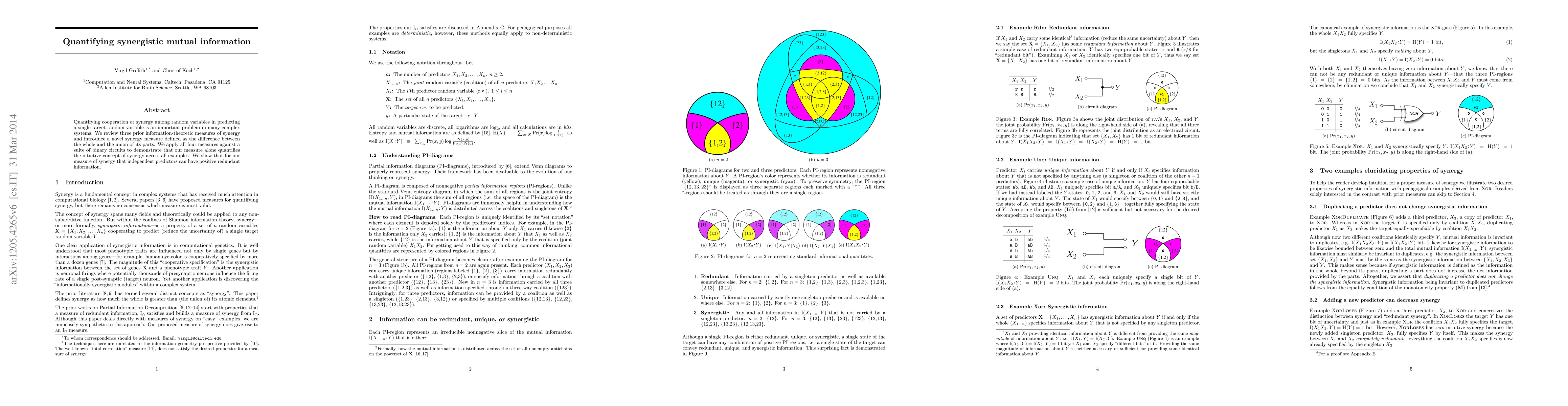 This paper introduces a new measure of synergy based on mutual information, comparing it with three existing measures. It demonstrates that the novel measure effectively captures the intuitive concept of synergy in binary circuits, showing that independent predictors can also have positive redundant information.