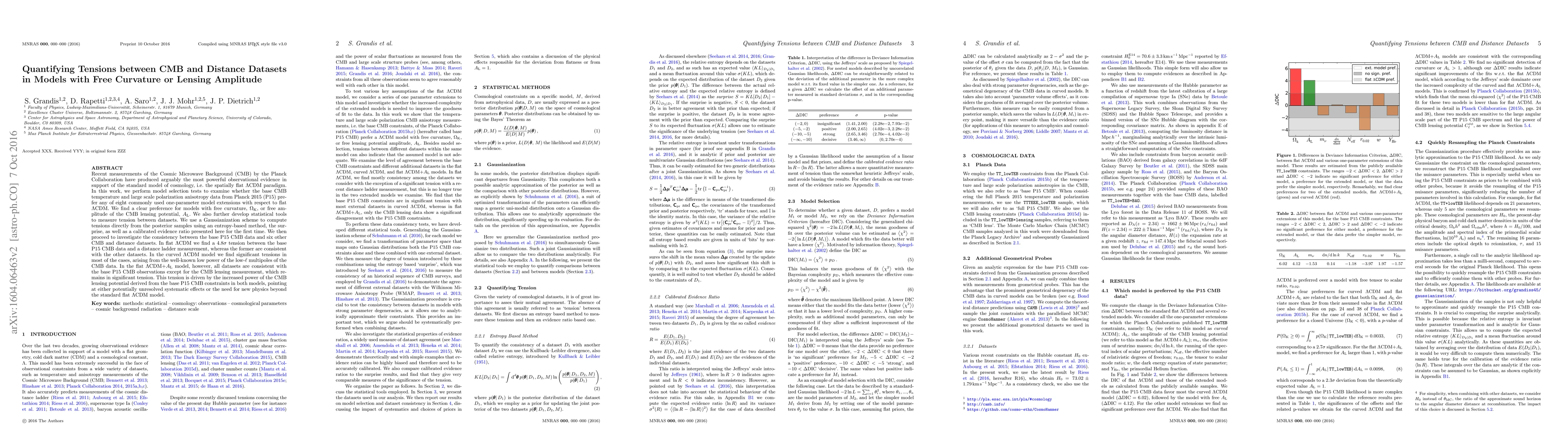 Recent measurements of the Cosmic Microwave Background (CMB) by the Planck Collaboration have produced arguably the most powerful observational evidence in support of the standard model of cosmology, i.e. the spatially flat $\Lambda$CDM paradigm. In this work, we perform model selection tests to examine whether the base CMB temperature and large scale polarization anisotropy data from Planck 2015 (P15) prefer any of eight commonly used one-parameter model extensions with respect to flat $\Lambda$CDM. We find a clear preference for models with free curvature, $\Omega_\mathrm{K}$, or free amplitude of the CMB lensing potential, $A_\mathrm{L}$. We also further develop statistical tools to measure tension between datasets. We use a Gaussianization scheme to compute tensions directly from the posterior samples using an entropy-based method, the surprise, as well as a calibrated evidence ratio presented here for the first time. We then proceed to investigate the consistency between the base P15~CMB data and six other CMB and distance datasets. In flat $\Lambda$CDM we find a $4.8\sigma$ tension between the base P15~CMB data and a distance ladder measurement, whereas the former are consistent with the other datasets. In the curved $\Lambda$CDM model we find significant tensions in most of the cases, arising from the well-known low power of the low-$\ell$ multipoles of the CMB data. In the flat $\Lambda$CDM $+A_\mathrm{L}$ model, however, all datasets are consistent with the base P15~CMB observations except for the CMB lensing measurement, which remains in significant tension. This tension is driven by the increased power of the CMB lensing potential derived from the base P15~CMB constraints in both models, pointing at either potentially unresolved systematic effects or the need for new physics beyond the standard flat $\Lambda$CDM model.