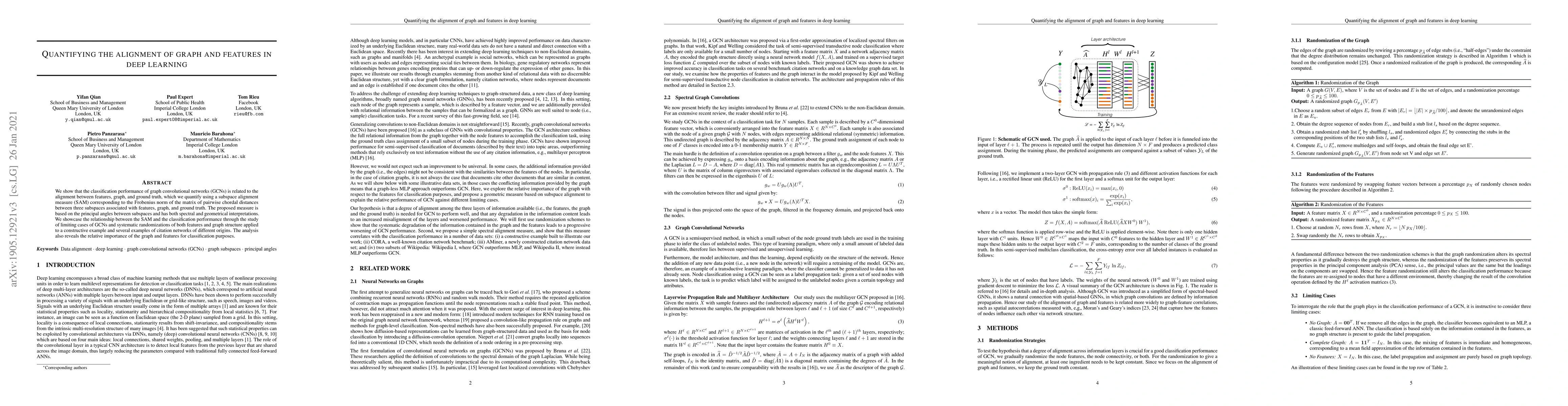 We show that the classification performance of graph convolutional networks (GCNs) is related to the alignment between features, graph, and ground truth, which we quantify using a subspace alignment measure (SAM) corresponding to the Frobenius norm of the matrix of pairwise chordal distances between three subspaces associated with features, graph, and ground truth. The proposed measure is based on the principal angles between subspaces and has both spectral and geometrical interpretations. We showcase the relationship between the SAM and the classification performance through the study of limiting cases of GCNs and systematic randomizations of both features and graph structure applied to a constructive example and several examples of citation networks of different origins. The analysis also reveals the relative importance of the graph and features for classification purposes.