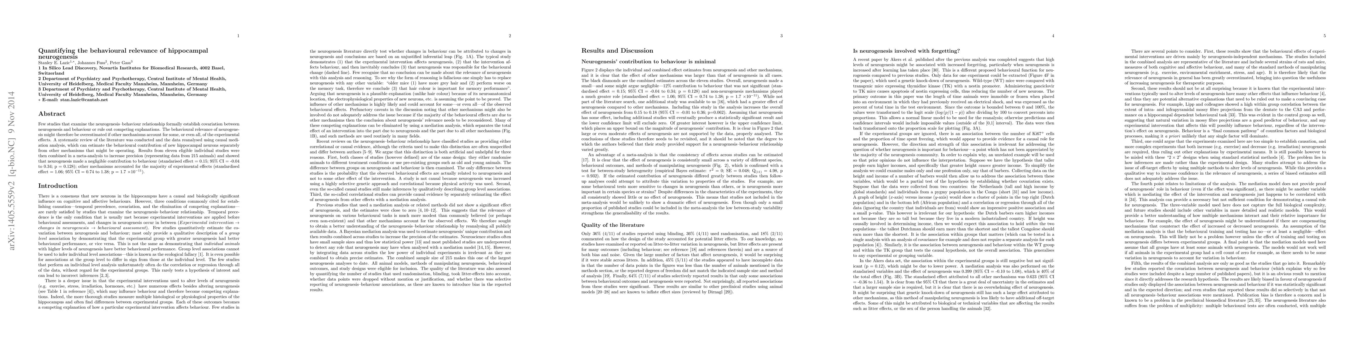 This study systematically reviews and reanalyses the relationship between hippocampal neurogenesis and behaviour, finding that neurogenesis contributes negligibly to behaviour, while other mechanisms account for the majority of observed effects. The meta-analysis of eleven studies indicates a small standardised effect of neurogenesis (0.15, 95% CI -0.04 to 0.34).