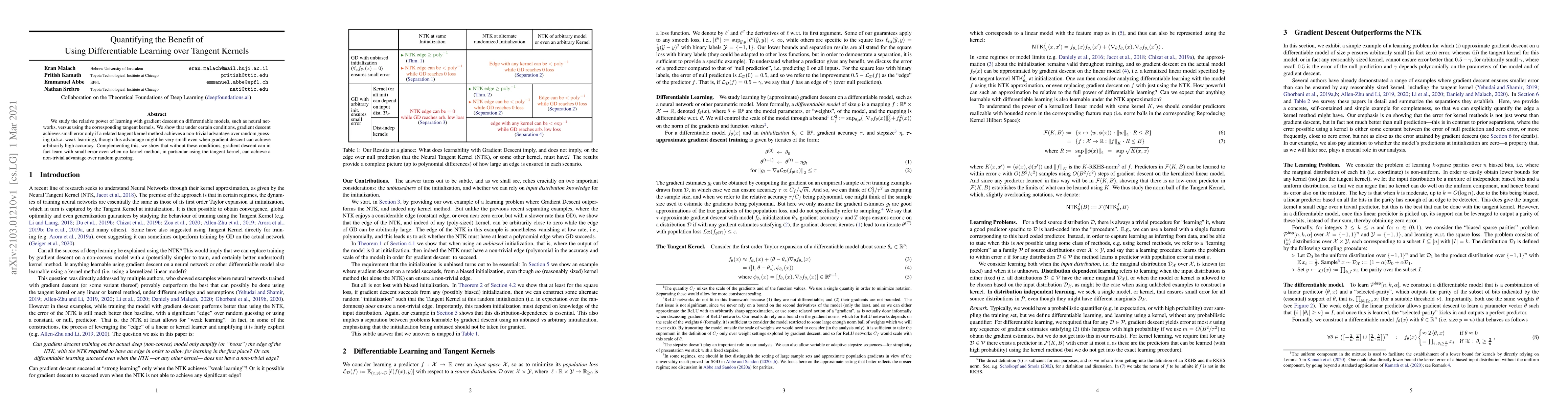 The paper explores the efficiency of gradient descent in training differentiable models like neural networks compared to tangent kernels. It reveals that gradient descent's success hinges on a small advantage of tangent kernel methods over random guessing, which might be negligible even when gradient descent achieves perfect accuracy. Conversely, without these conditions, gradient descent can still perform well, while tangent kernel methods fail to surpass random guessing.