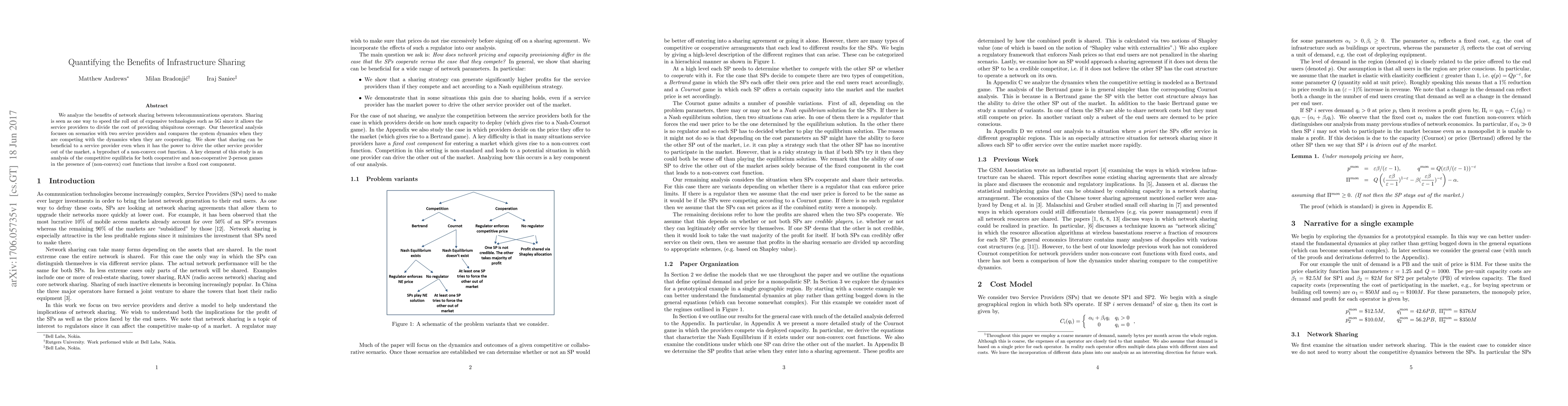 This paper quantifies the benefits of network sharing among telecommunications operators, demonstrating that sharing can reduce costs and accelerate technology deployment like 5G. It compares competitive and cooperative dynamics, showing that even dominant providers can benefit from sharing due to non-convex cost functions.