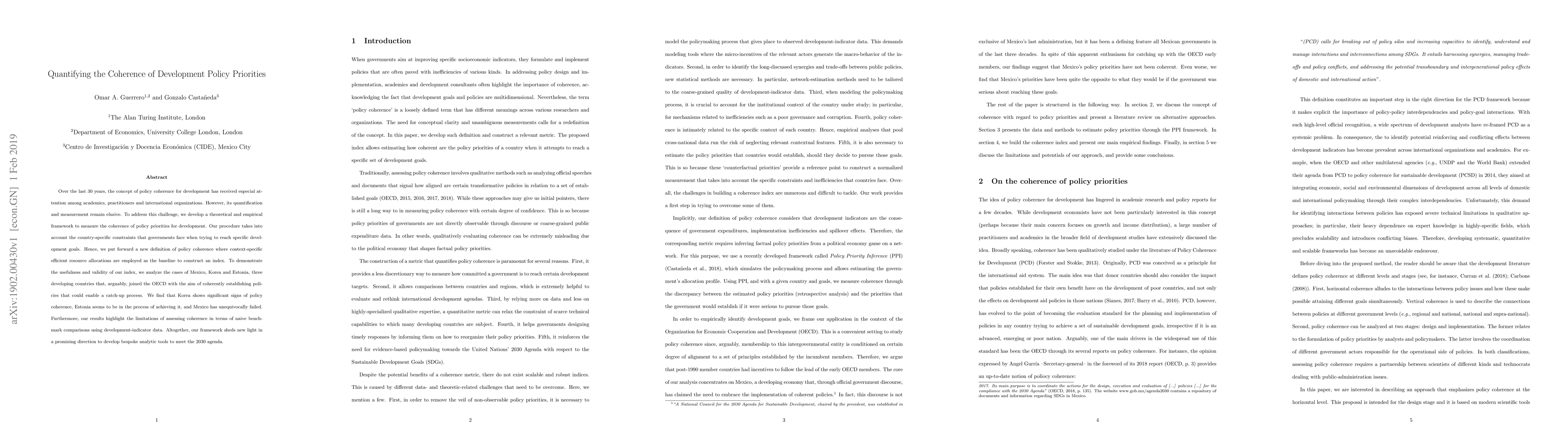Over the last 30 years, the concept of policy coherence for development has received especial attention among academics, practitioners and international organizations. However, its quantification and measurement remain elusive. To address this challenge, we develop a theoretical and empirical framework to measure the coherence of policy priorities for development. Our procedure takes into account the country-specific constraints that governments face when trying to reach specific development goals. Hence, we put forward a new definition of policy coherence where context-specific efficient resource allocations are employed as the baseline to construct an index. To demonstrate the usefulness and validity of our index, we analyze the cases of Mexico, Korea and Estonia, three developing countries that, arguably, joined the OECD with the aim of coherently establishing policies that could enable a catch-up process. We find that Korea shows significant signs of policy coherence, Estonia seems to be in the process of achieving it, and Mexico has unequivocally failed. Furthermore, our results highlight the limitations of assessing coherence in terms of naive benchmark comparisons using development-indicator data. Altogether, our framework sheds new light in a promising direction to develop bespoke analytic tools to meet the 2030 agenda.
