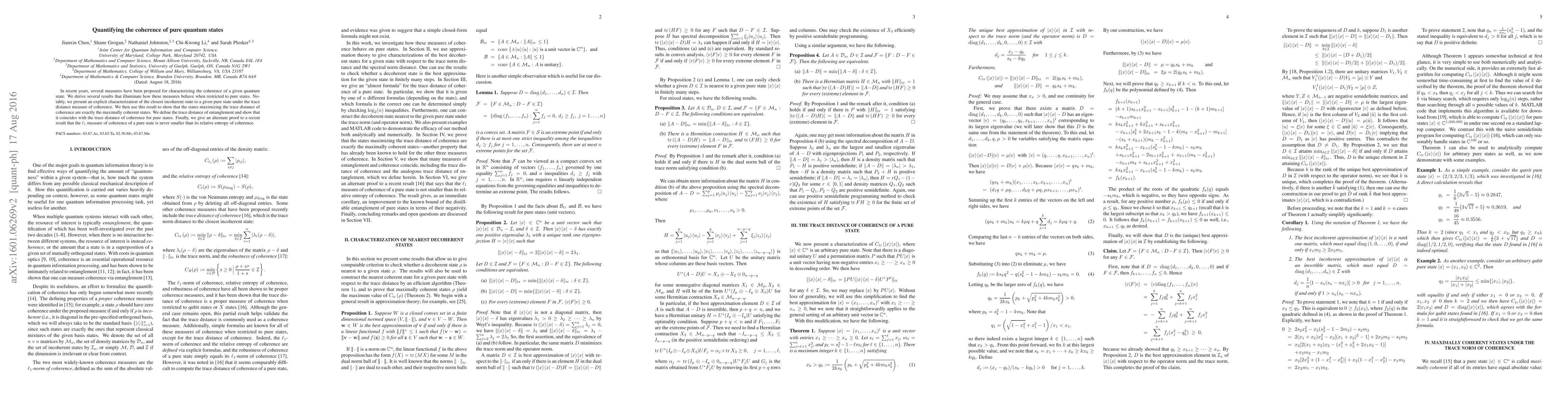 This paper derives measures for quantum state coherence, specifically focusing on pure states. It characterizes the closest incoherent state to a pure state under the trace distance measure and shows that the states maximizing this coherence measure are maximally coherent. Additionally, it establishes the equivalence between the trace distance of entanglement and coherence for pure states.
