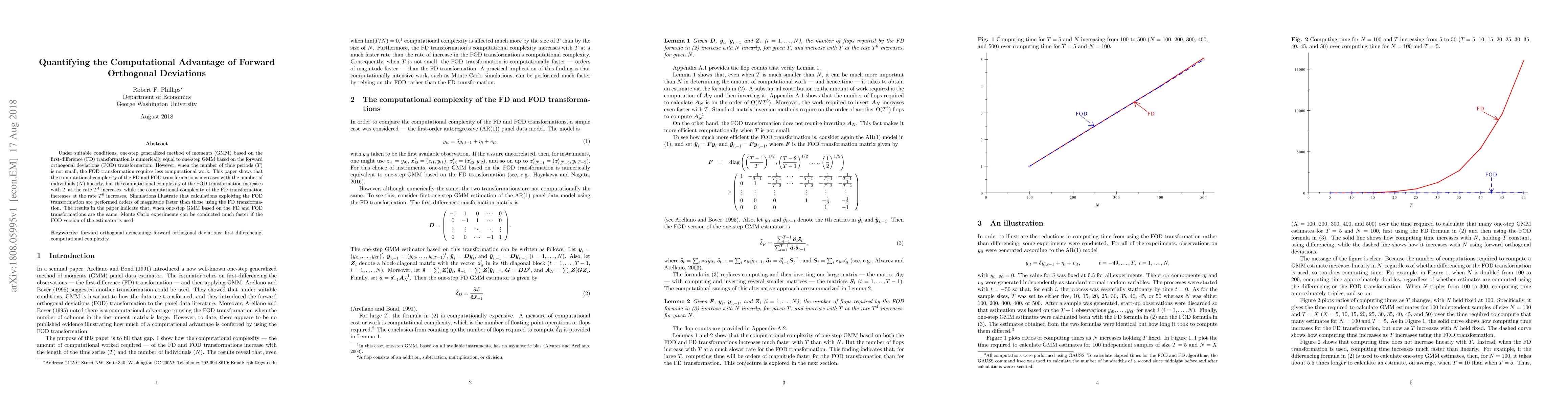 Under suitable conditions, one-step generalized method of moments (GMM) based on the first-difference (FD) transformation is numerically equal to one-step GMM based on the forward orthogonal deviations (FOD) transformation. However, when the number of time periods ($T$) is not small, the FOD transformation requires less computational work. This paper shows that the computational complexity of the FD and FOD transformations increases with the number of individuals ($N$) linearly, but the computational complexity of the FOD transformation increases with $T$ at the rate $T^{4}$ increases, while the computational complexity of the FD transformation increases at the rate $T^{6}$ increases. Simulations illustrate that calculations exploiting the FOD transformation are performed orders of magnitude faster than those using the FD transformation. The results in the paper indicate that, when one-step GMM based on the FD and FOD transformations are the same, Monte Carlo experiments can be conducted much faster if the FOD version of the estimator is used.