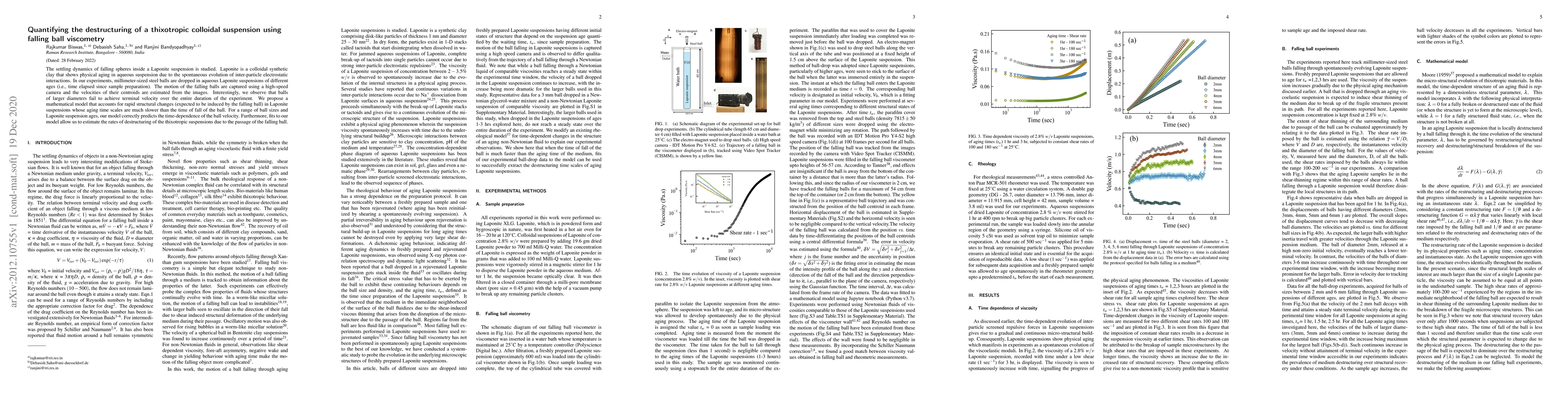 This study investigates the settling dynamics of falling steel balls in thixotropic Laponite suspensions using falling ball viscometry. The model developed accurately predicts the time-dependent velocity of the balls, revealing the rates of structural destructuring in the suspensions due to the falling balls.