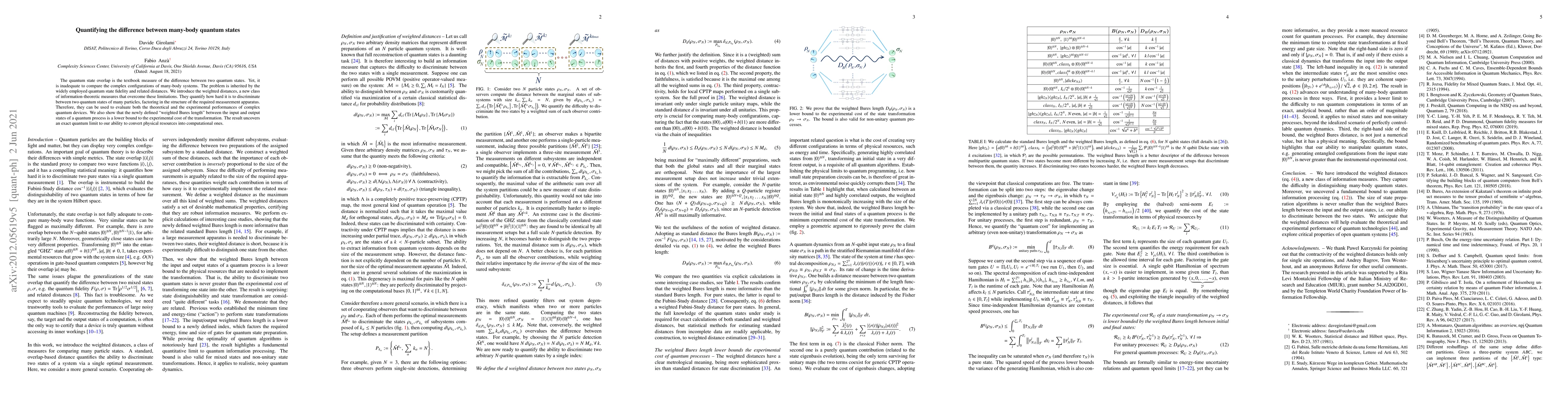 The quantum state overlap is the textbook measure of the difference between two quantum states. Yet, it is inadequate to compare the complex configurations of many-body systems. The problem is inherited by the widely employed quantum state fidelity and related distances. We introduce the weighted distances, a new class of information-theoretic measures that overcome these limitations. They quantify how hard it is to discriminate between two quantum states of many particles, factoring in the structure of the required measurement apparatus. Therefore, they can be used to evaluate both the theoretical and the experimental performances of complex quantum devices. We also show that the newly defined "weighted Bures length" between the input and output states of a quantum process is a lower bound to the experimental cost of the transformation. The result uncovers an exact quantum limit to our ability to convert physical resources into computational ones.