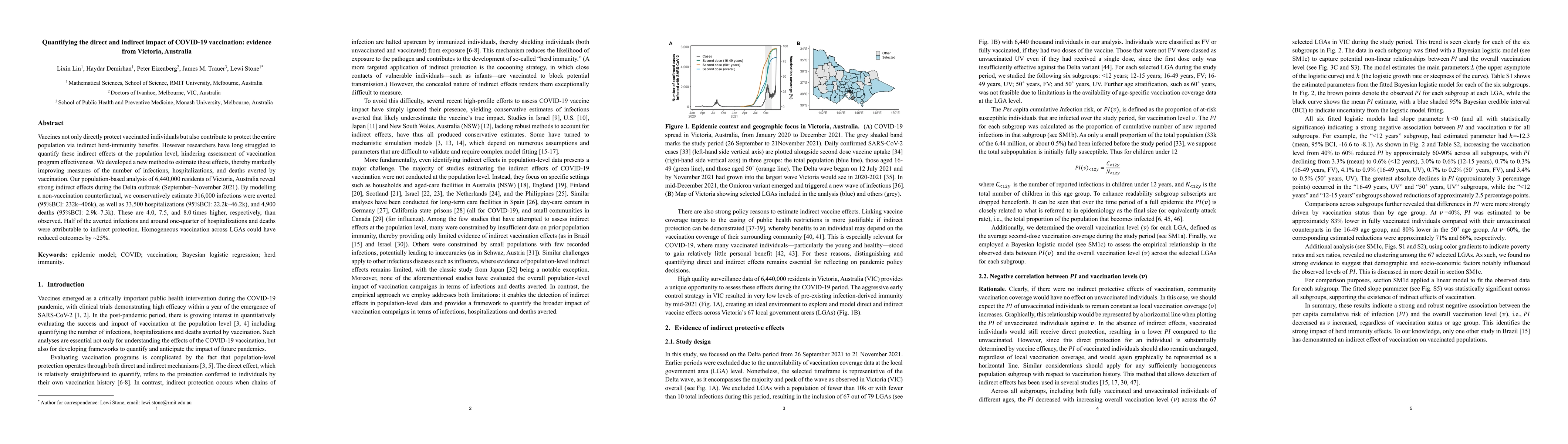 Vaccines not only directly protect vaccinated individuals but also contribute to protect the entire population via indirect herd-immunity benefits. However, researchers have long struggled to quantify these indirect effects at the population level, hindering assessment of vaccination program effectiveness. We developed a new method to estimate these effects, thereby markedly improving measures of the number of infections, hospitalizations, and deaths averted by vaccination. Our population-based analysis of 6,440,000 residents of Victoria, Australia reveal strong indirect effects during the Delta outbreak (September-November 2021). By modelling a non-vaccination counterfactual, we conservatively estimate 316,000 infections were averted (95\% BCI: 232k-406k), as well as 33,500 hospitalizations (95\% BCI: 22.2k-46.2k), and 4,900 deaths (95\% BCI: 2.9k-7.3k). These are 4.0, 7.5, and 8.0 times higher, respectively, than observed. Half of the averted infections and around one-quarter of hospitalizations and deaths were attributable to indirect protection. Homogeneous vaccination across LGAs could have reduced outcomes by approximately 25\%.