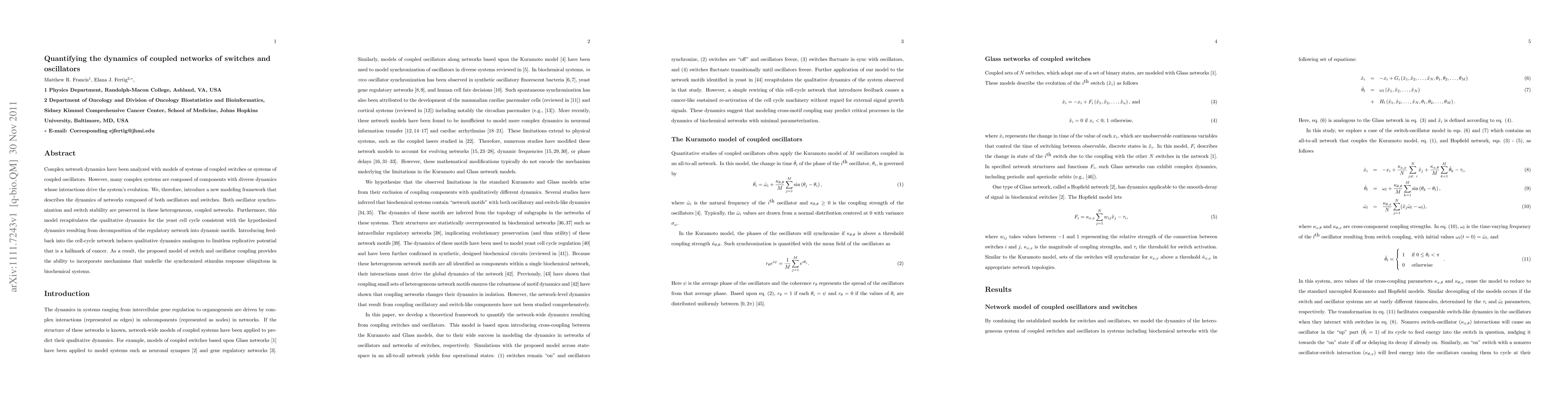 Complex network dynamics have been analyzed with models of systems of coupled switches or systems of coupled oscillators. However, many complex systems are composed of components with diverse dynamics whose interactions drive the system's evolution. We, therefore, introduce a new modeling framework that describes the dynamics of networks composed of both oscillators and switches. Both oscillator synchronization and switch stability are preserved in these heterogeneous, coupled networks. Furthermore, this model recapitulates the qualitative dynamics for the yeast cell cycle consistent with the hypothesized dynamics resulting from decomposition of the regulatory network into dynamic motifs. Introducing feedback into the cell-cycle network induces qualitative dynamics analogous to limitless replicative potential that is a hallmark of cancer. As a result, the proposed model of switch and oscillator coupling provides the ability to incorporate mechanisms that underlie the synchronized stimulus response ubiquitous in biochemical systems.