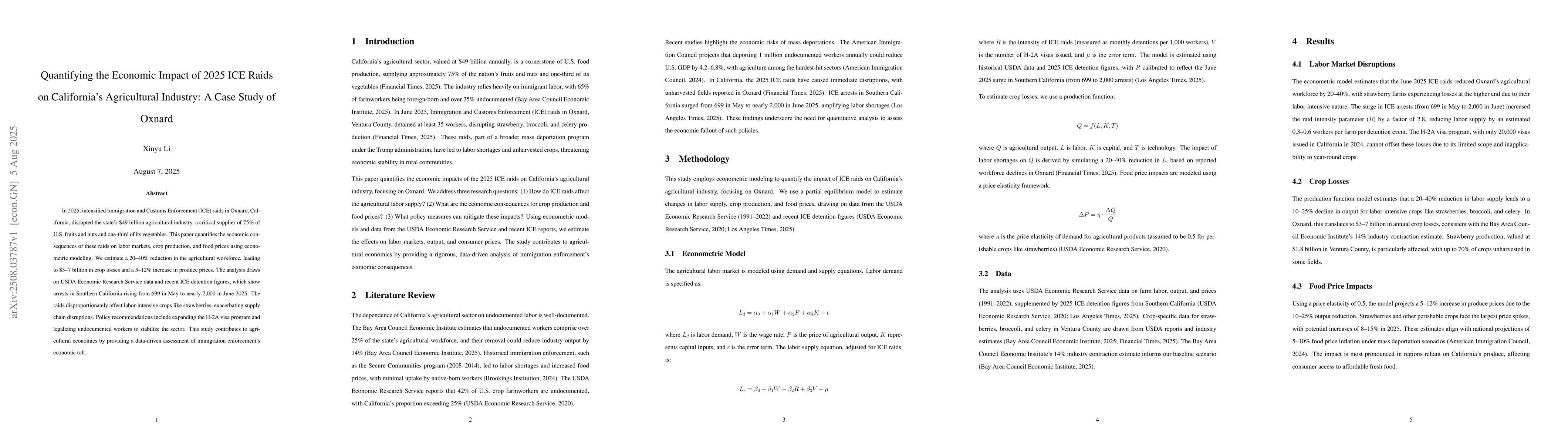 In 2025, intensified Immigration and Customs Enforcement (ICE) raids in Oxnard, California, disrupted the state's \$49 billion agricultural industry, a critical supplier of 75% of U.S. fruits and nuts and one-third of its vegetables. This paper quantifies the economic consequences of these raids on labor markets, crop production, and food prices using econometric modeling. We estimate a 20-40% reduction in the agricultural workforce, leading to \$3-7 billion in crop losses and a 5-12% increase in produce prices. The analysis draws on USDA Economic Research Service data and recent ICE detention figures, which show arrests in Southern California rising from 699 in May to nearly 2,000 in June 2025. The raids disproportionately affect labor-intensive crops like strawberries, exacerbating supply chain disruptions. Policy recommendations include expanding the H-2A visa program and legalizing undocumented workers to stabilize the sector. This study contributes to agricultural economics by providing a data-driven assessment of immigration enforcement's economic toll.
