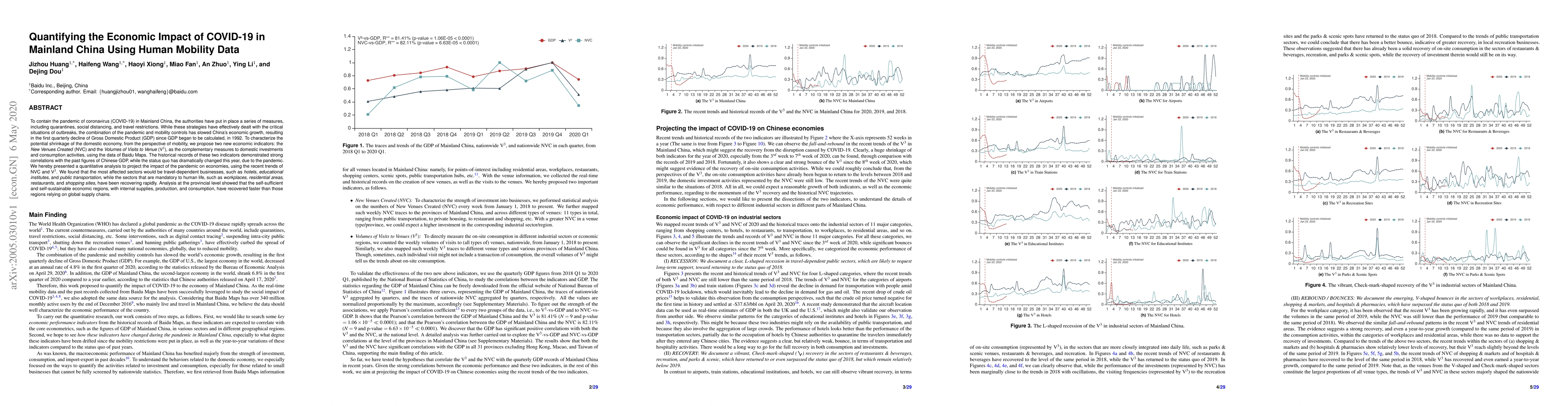 This paper quantifies the economic impact of COVID-19 in Mainland China using human mobility data, proposing new economic indicators NVC and V^3. It finds that travel-dependent sectors are most affected, while essential sectors are recovering, with self-sufficient regions rebounding faster than those reliant on global supply chains.
