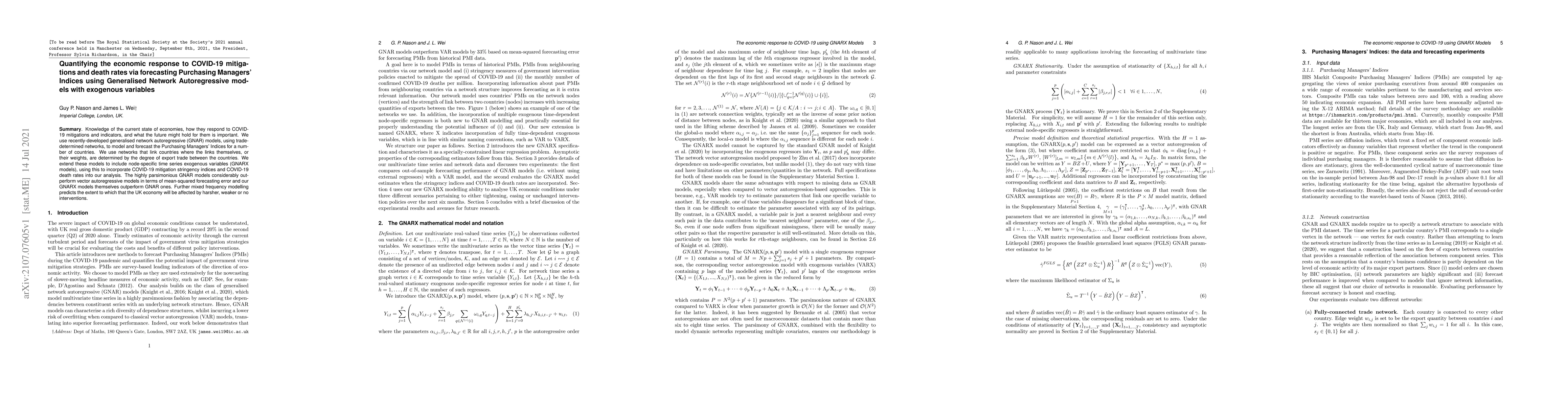 Knowledge of the current state of economies, how they respond to COVID-19 mitigations and indicators, and what the future might hold for them is important. We use recently-developed generalised network autoregressive (GNAR) models, using trade-determined networks, to model and forecast the Purchasing Managers' Indices for a number of countries. We use networks that link countries where the links themselves, or their weights, are determined by the degree of export trade between the countries. We extend these models to include node-specific time series exogenous variables (GNARX models), using this to incorporate COVID-19 mitigation stringency indices and COVID-19 death rates into our analysis. The highly parsimonious GNAR models considerably outperform vector autoregressive models in terms of mean-squared forecasting error and our GNARX models themselves outperform GNAR ones. Further mixed frequency modelling predicts the extent to which that the UK economy will be affected by harsher, weaker or no interventions.