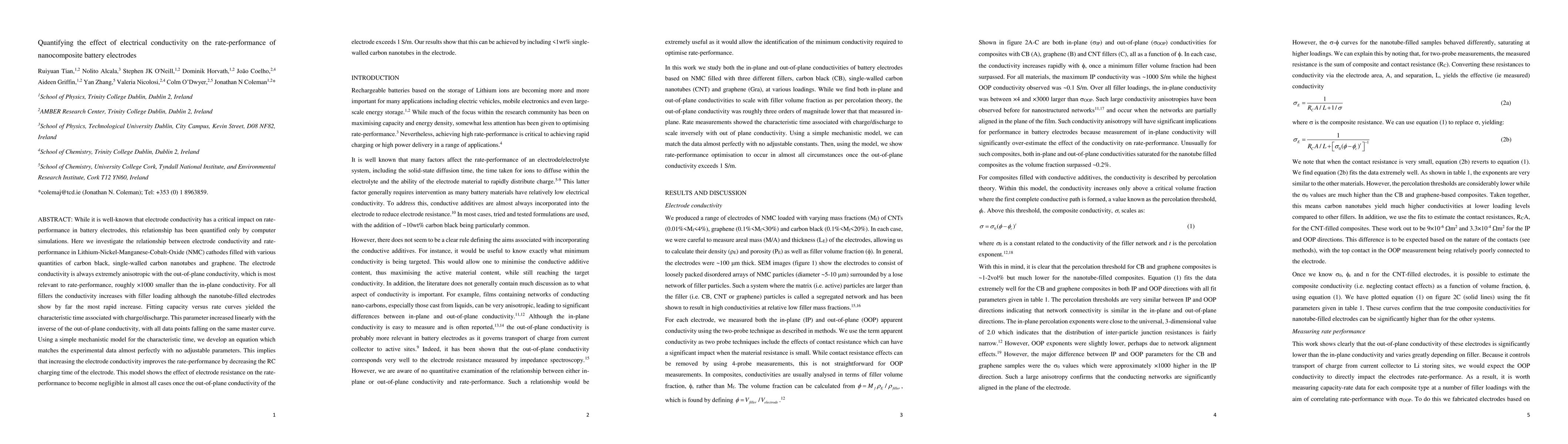 While it is well-known that electrode conductivity has a critical impact on rate-performance in battery electrodes, this relationship has been quantified only by computer simulations. Here we investigate the relationship between electrode conductivity and rate-performance in Lithium-Nickel-Manganese-Cobalt-Oxide (NMC) cathodes filled with various quantities of carbon black, single-walled carbon nanotubes and graphene. The electrode conductivity is always extremely anisotropic with the out-of-plane conductivity, which is most relevant to rate-performance, roughly 1000 smaller than the in-plane conductivity. For all fillers the conductivity increases with filler loading although the nanotube-filled electrodes show by far the most rapid increase. Fitting capacity versus rate curves yielded the characteristic time associated with charge/discharge. This parameter increased linearly with the inverse of the out-of-plane conductivity, with all data points falling on the same master curve. Using a simple mechanistic model for the characteristic time, we develop an equation which matches the experimental data almost perfectly with no adjustable parameters. This implies that increasing the electrode conductivity improves the rate-performance by decreasing the RC charging time of the electrode. This model shows the effect of electrode resistance on the rate-performance to become negligible in almost all cases once the out-of-plane conductivity of the electrode exceeds 1 S/m. Our results show that this can be achieved by including <1wt% single-walled carbon nanotubes in the electrode.