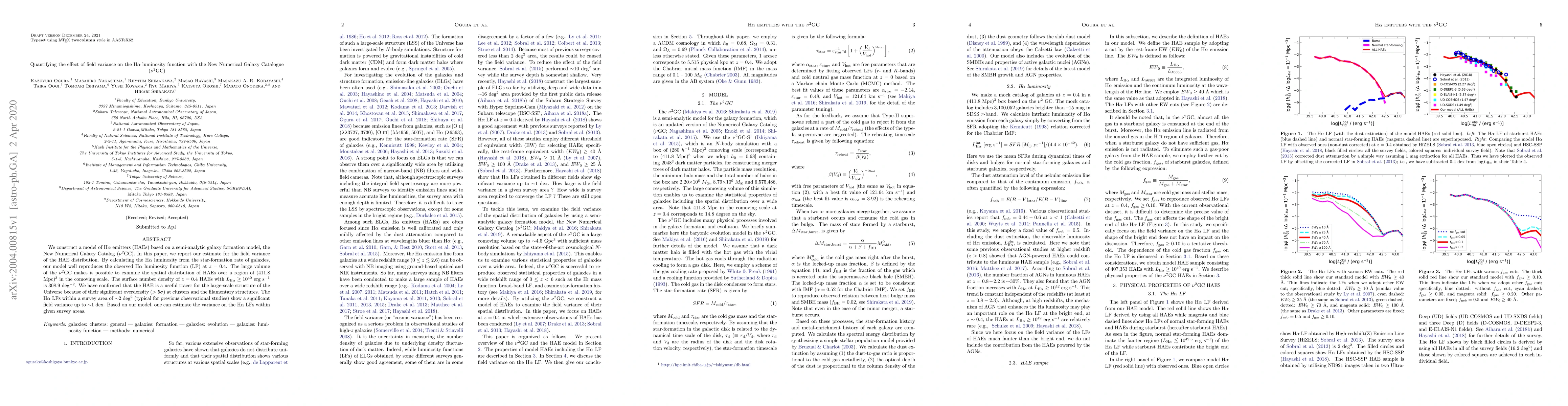 This paper models H$\alpha$ emitters using the $\nu^2$GC and estimates the field variance of their distribution, finding significant overdensity in clusters and filaments. The study shows a field variance of up to 1 dex in H$\alpha$ luminosity functions within typical survey areas, providing a tool to estimate this variance.