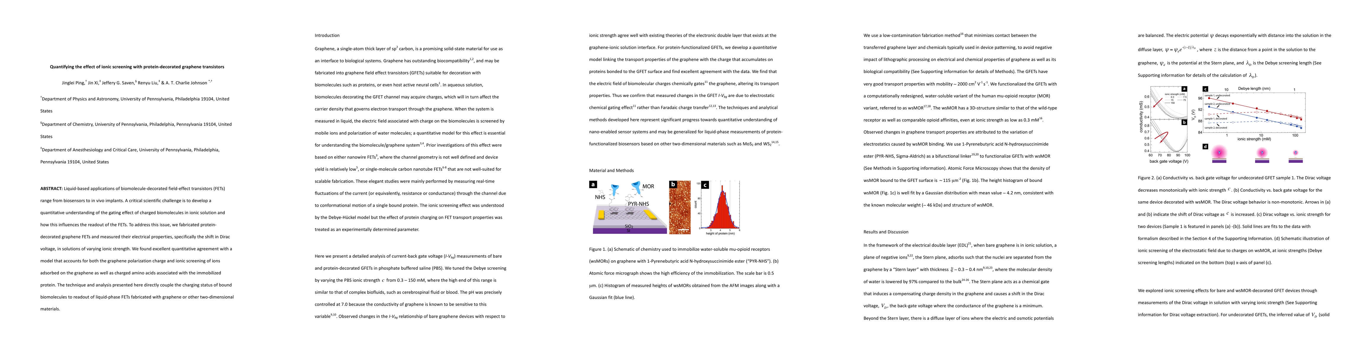 Liquid-based applications of biomolecule-decorated field-effect transistors (FETs) range from biosensors to in vivo implants. A critical scientific challenge is to develop a quantitative understanding of the gating effect of charged biomolecules in ionic solution and how this influences the readout of the FETs. To address this issue, we fabricated protein-decorated graphene FETs and measured their electrical properties, specifically the shift in Dirac voltage, in solutions of varying ionic strength. We found excellent quantitative agreement with a model that accounts for both the graphene polarization charge and ionic screening of ions adsorbed on the graphene as well as charged amino acids associated with the immobilized protein. The technique and analysis presented here directly couple the charging status of bound biomolecules to readout of liquid-phase FETs fabricated with graphene or other two-dimensional materials.