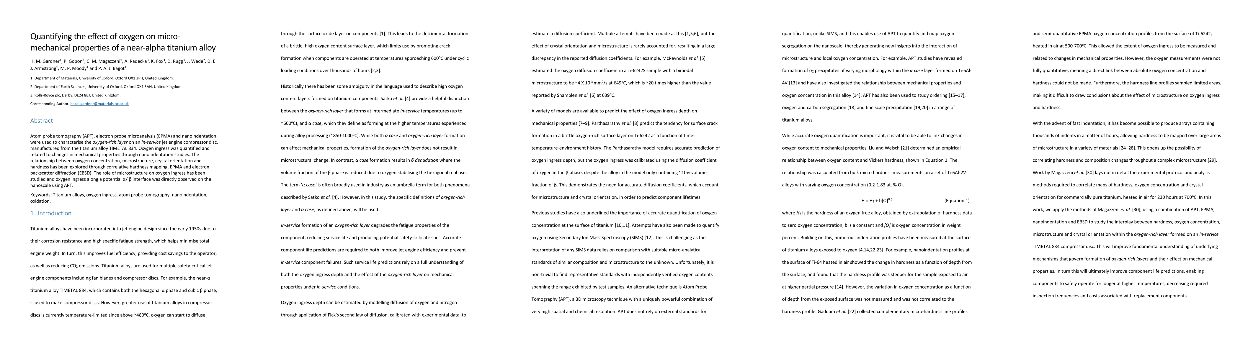 This study uses APT, EPMA, and nanoindentation to characterize the oxygen-rich layer on a TIMETAL 834 titanium alloy jet engine compressor disc, quantifying the effect of oxygen on micro-mechanical properties. The research reveals the relationship between oxygen concentration, microstructure, and hardness, with direct nanoscale observation of oxygen ingress along alpha/beta interfaces.