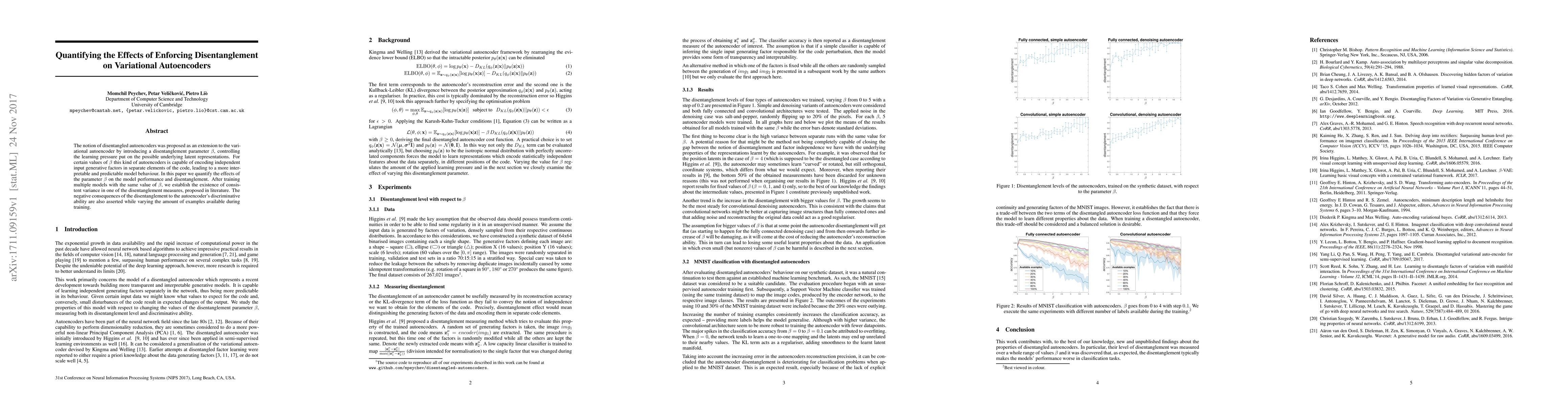 This paper investigates the impact of the disentanglement parameter $\beta$ on variational autoencoders, finding consistent variance in disentanglement measures and noting a trade-off between disentanglement and discriminative ability, especially with limited training data.