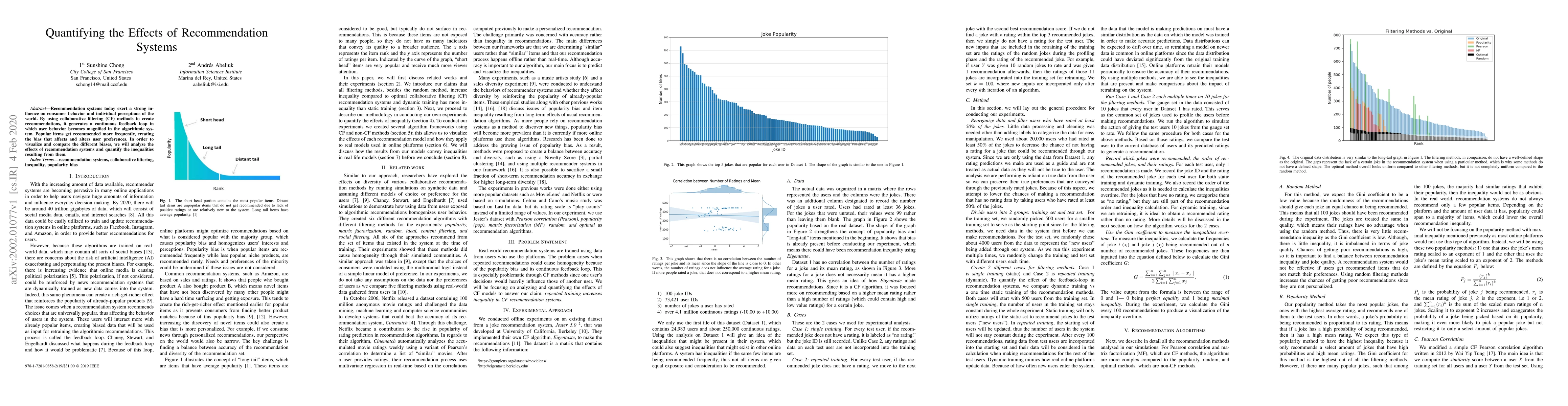 Recommendation systems today exert a strong influence on consumer behavior and individual perceptions of the world. By using collaborative filtering (CF) methods to create recommendations, it generates a continuous feedback loop in which user behavior becomes magnified in the algorithmic system. Popular items get recommended more frequently, creating the bias that affects and alters user preferences. In order to visualize and compare the different biases, we will analyze the effects of recommendation systems and quantify the inequalities resulting from them.