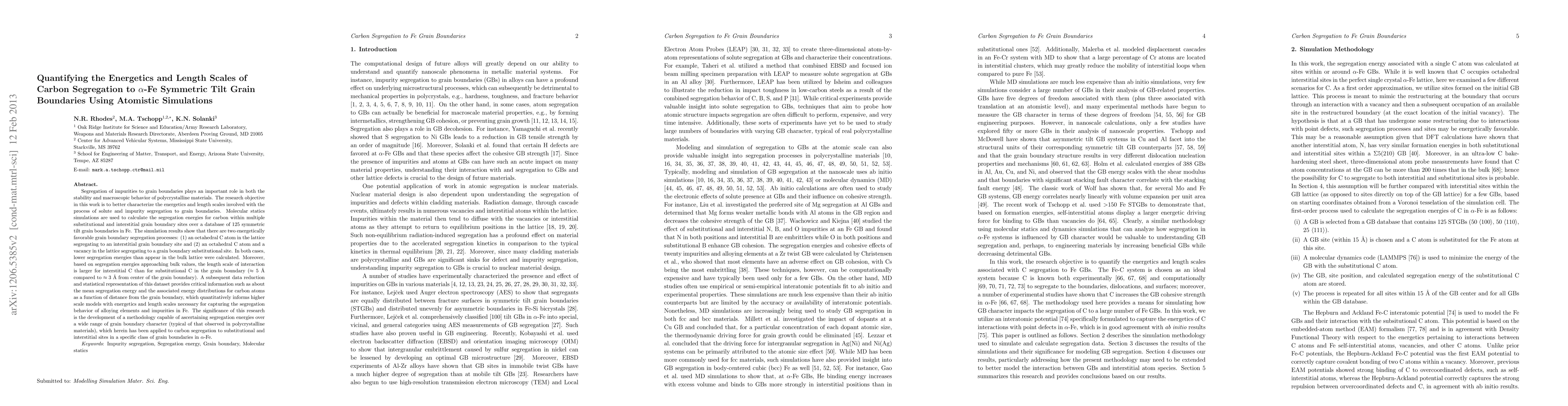 This study uses molecular dynamics simulations to quantify the energetics and length scales of carbon segregation to symmetric tilt grain boundaries in Fe, revealing lower segregation energies near grain boundaries and an energetic length scale of 5-12 Å for carbon. The research provides critical data on mean segregation energy and energy distributions, informing higher-scale models for impurity segregation in polycrystalline materials.