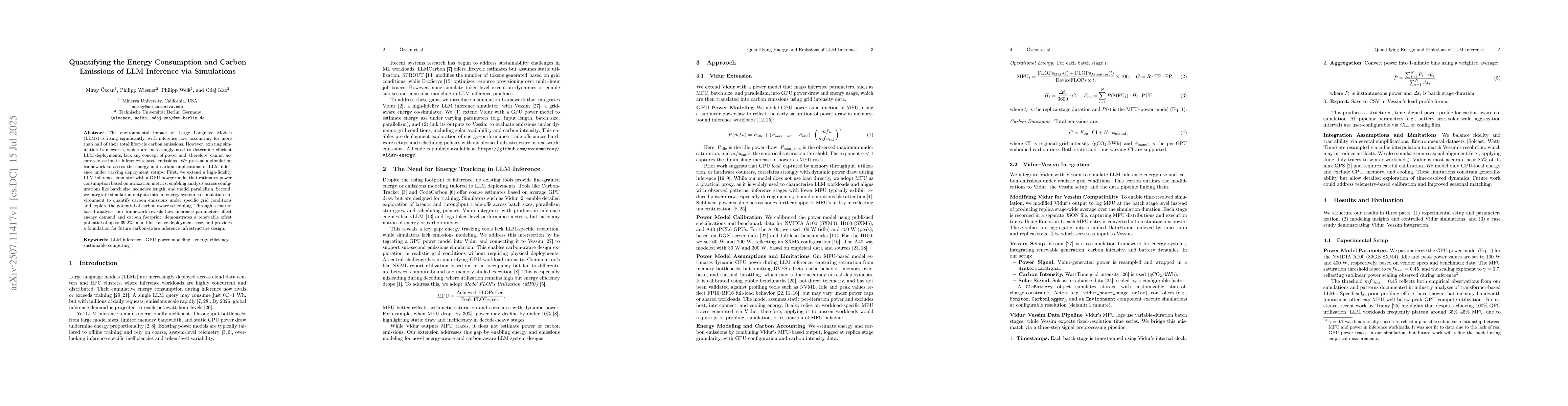 The environmental impact of Large Language Models (LLMs) is rising significantly, with inference now accounting for more than half of their total lifecycle carbon emissions. However, existing simulation frameworks, which are increasingly used to determine efficient LLM deployments, lack any concept of power and, therefore, cannot accurately estimate inference-related emissions. We present a simulation framework to assess the energy and carbon implications of LLM inference under varying deployment setups. First, we extend a high-fidelity LLM inference simulator with a GPU power model that estimates power consumption based on utilization metrics, enabling analysis across configurations like batch size, sequence length, and model parallelism. Second, we integrate simulation outputs into an energy system co-simulation environment to quantify carbon emissions under specific grid conditions and explore the potential of carbon-aware scheduling. Through scenario-based analysis, our framework reveals how inference parameters affect energy demand and carbon footprint, demonstrates a renewable offset potential of up to 69.2% in an illustrative deployment case, and provides a foundation for future carbon-aware inference infrastructure design.