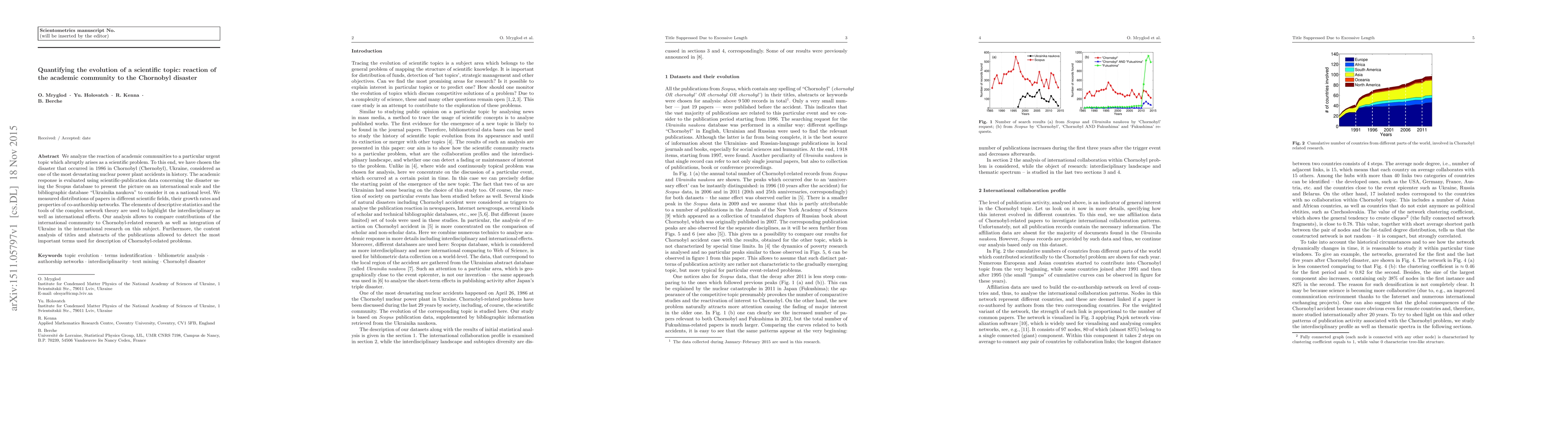 We analyze the reaction of academic communities to a particular urgent topic which abruptly arises as a scientific problem. To this end, we have chosen the disaster that occurred in 1986 in Chornobyl (Chernobyl), Ukraine, considered as one of the most devastating nuclear power plant accidents in history. The academic response is evaluated using scientific-publication data concerning the disaster using the Scopus database to present the picture on an international scale and the bibliographic database "Ukrainika naukova" to consider it on a national level. We measured distributions of papers in different scientific fields, their growth rates and properties of co-authorship networks. {The elements of descriptive statistics and the tools of the complex network theory are used to highlight the interdisciplinary as well as international effects.} Our analysis allows to compare contributions of the international community to Chornobyl-related research as well as integration of Ukraine in the international research on this subject. Furthermore, the content analysis of titles and abstracts of the publications allowed to detect the most important terms used for description of Chornobyl-related problems.