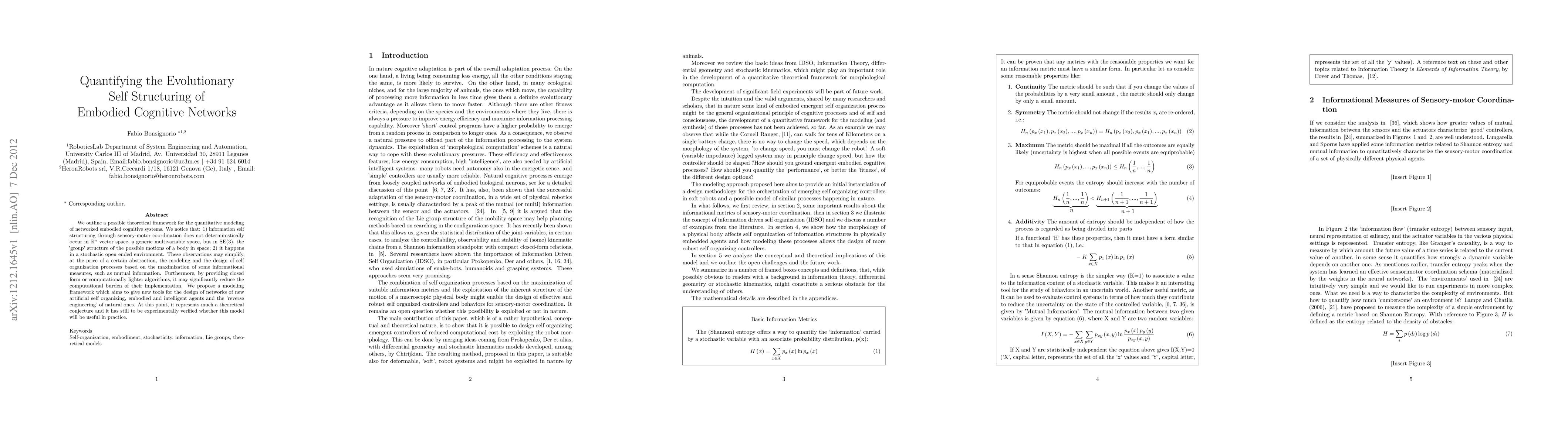 We outline a possible theoretical framework for the quantitative modeling of networked embodied cognitive systems. We notice that: 1) information self structuring through sensory-motor coordination does not deterministically occur in Rn vector space, a generic multivariable space, but in SE(3), the group structure of the possible motions of a body in space; 2) it happens in a stochastic open ended environment. These observations may simplify, at the price of a certain abstraction, the modeling and the design of self organization processes based on the maximization of some informational measures, such as mutual information. Furthermore, by providing closed form or computationally lighter algorithms, it may significantly reduce the computational burden of their implementation. We propose a modeling framework which aims to give new tools for the design of networks of new artificial self organizing, embodied and intelligent agents and the reverse engineering of natural ones. At this point, it represents much a theoretical conjecture and it has still to be experimentally verified whether this model will be useful in practice..
