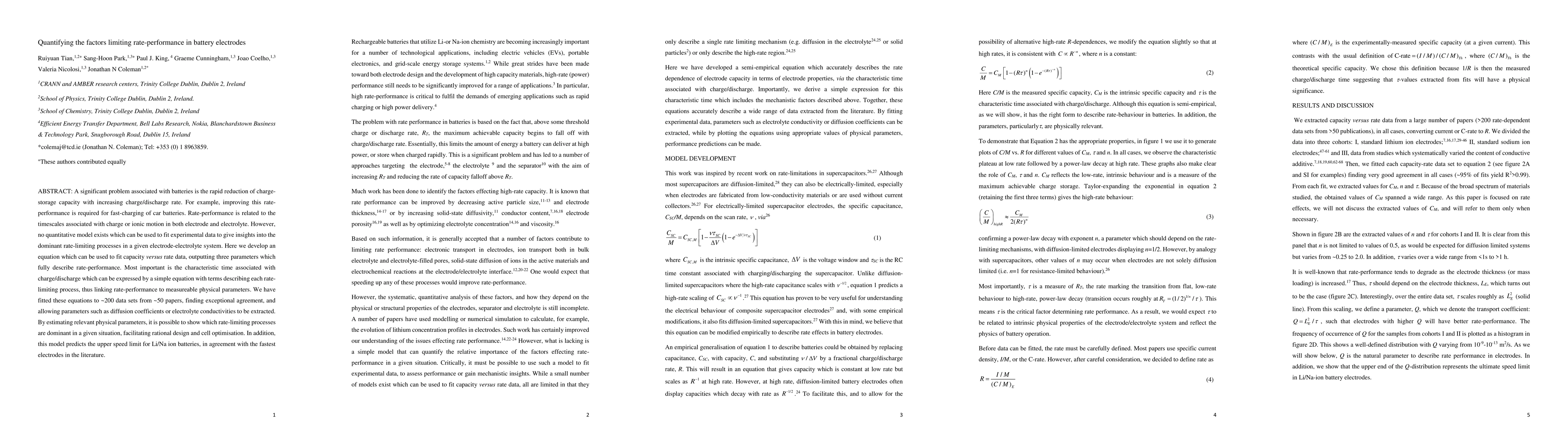 A significant problem associated with batteries is the rapid reduction of charge-storage capacity with increasing charge/discharge rate. For example, improving this rate-performance is required for fast-charging of car batteries. Rate-performance is related to the timescales associated with charge or ionic motion in both electrode and electrolyte. However, no quantitative model exists which can be used to fit experimental data to give insights into the dominant rate-limiting processes in a given electrode-electrolyte system. Here we develop an equation which can be used to fit capacity versus rate data, outputting three parameters which fully describe rate-performance. Most important is the characteristic time associated with charge/discharge which can be expressed by a simple equation with terms describing each rate-limiting process, thus linking rate-performance to measurable physical parameters. We have fitted these equations to ~200 data sets from ~50 papers, finding exceptional agreement, and allowing parameters such as diffusion coefficients or electrolyte conductivities to be extracted. By estimating relevant physical parameters, it is possible to show which rate-limiting processes are dominant in a given situation, facilitating rational design and cell optimization. In addition, this model predicts the upper speed limit for Li/Na ion batteries, in agreement with the fastest electrodes in the literature.