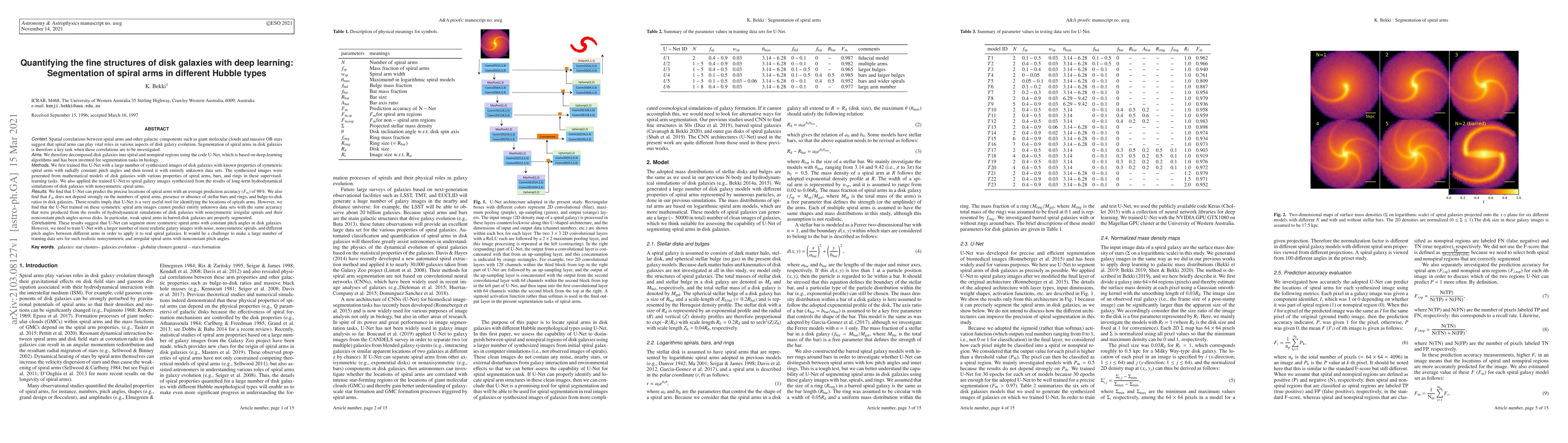 This paper employs deep learning, specifically U-net, to segment spiral arms in disk galaxies of different Hubble types, aiming to quantify their fine structures and investigate their roles in galaxy evolution. The study highlights the importance of spiral arm segmentation in understanding spatial correlations with galactic components.