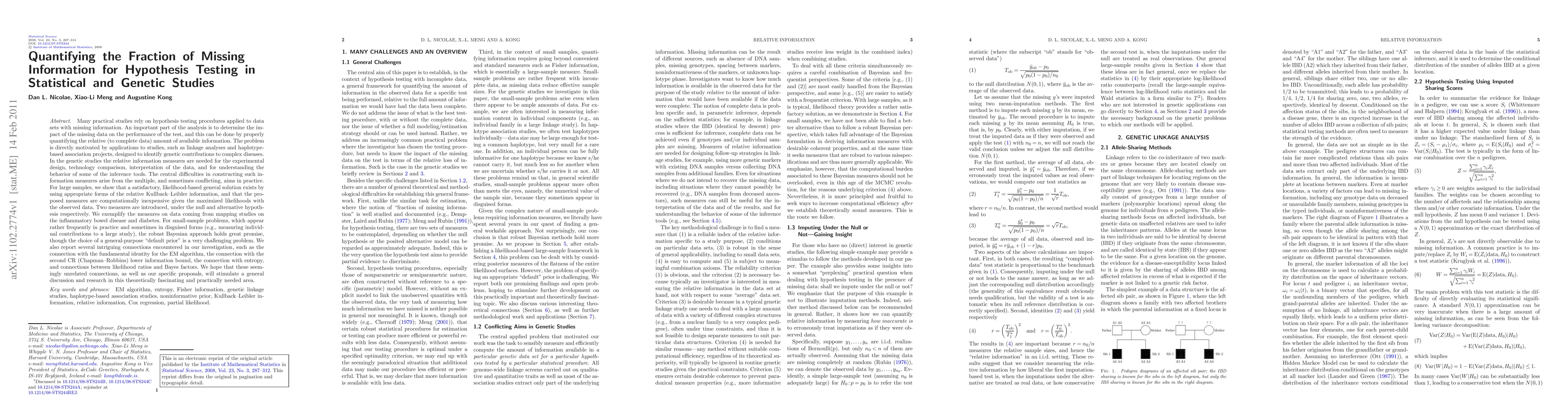 This paper proposes measures to quantify the fraction of missing information in hypothesis testing for datasets with incomplete data, particularly in genetic studies. It introduces two relative Kullback-Leibler information measures for large samples and discusses the application of a robust Bayesian approach for small samples, exemplified through mapping studies on inflammatory bowel disease and diabetes.