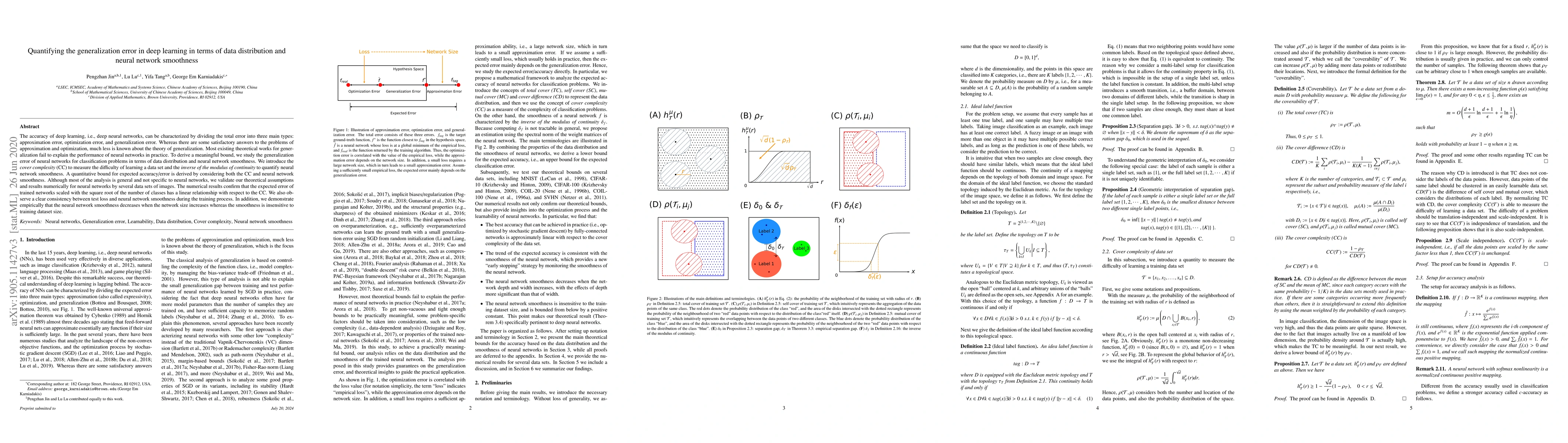 This paper develops a theoretical framework to quantify the generalization error in deep learning, focusing on data distribution and neural network smoothness. It introduces cover complexity to measure learning difficulty and uses neural network smoothness to derive a quantitative bound for expected accuracy, validated through image dataset experiments.