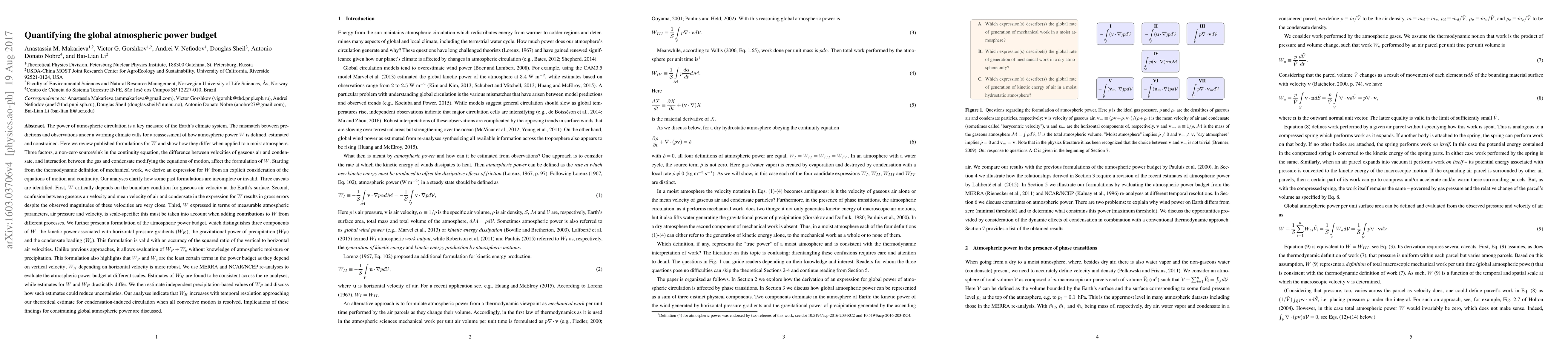 The power of atmospheric circulation is a key measure of the Earth's climate system. The mismatch between predictions and observations under a warming climate calls for a reassessment of how atmospheric power $W$ is defined, estimated and constrained. Here we review published formulations for $W$ and show how they differ when applied to a moist atmosphere. Three factors, a non-zero source/sink in the continuity equation, the difference between velocities of gaseous air and condensate, and interaction between the gas and condensate modifying the equations of motion, affect the formulation of $W$. Starting from the thermodynamic definition of mechanical work, we derive an expression for $W$ from an explicit consideration of the equations of motion and continuity. Our analyses clarify how some past formulations are incomplete or invalid. Three caveats are identified. First, $W$ critically depends on the boundary condition for gaseous air velocity at the Earth's surface. Second, confusion between gaseous air velocity and mean velocity of air and condensate in the expression for $W$ results in gross errors despite the observed magnitudes of these velocities are very close. Third, $W$ expressed in terms of measurable atmospheric parameters, air pressure and velocity, is scale-specific; this must be taken into account when adding contributions to $W$ from different processes. We present a formulation of the atmospheric power budget, which distinguishes three components of $W$: the kinetic power associated with horizontal pressure gradients ($W_K$), the gravitational power of precipitation ($W_P$) and the condensate loading ($W_c$). We use MERRA and NCAR/NCEP re-analyses to evaluate the atmospheric power budget at different scales: $W_K$ increases with temporal resolution approaching our theoretical estimate for condensation-induced circulation when all convective motion is resolved.
