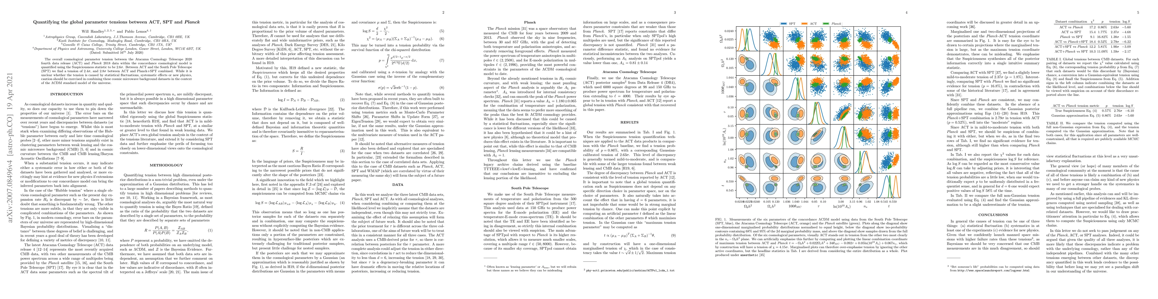 The research quantifies global parameter tensions between ACT, SPT, and Planck using a novel statistic called Suspiciousness, which corrects for dependence on prior volume, unlike traditional methods. It applies this statistic to the latest CMB datasets from Planck, SPT, and ACT.
