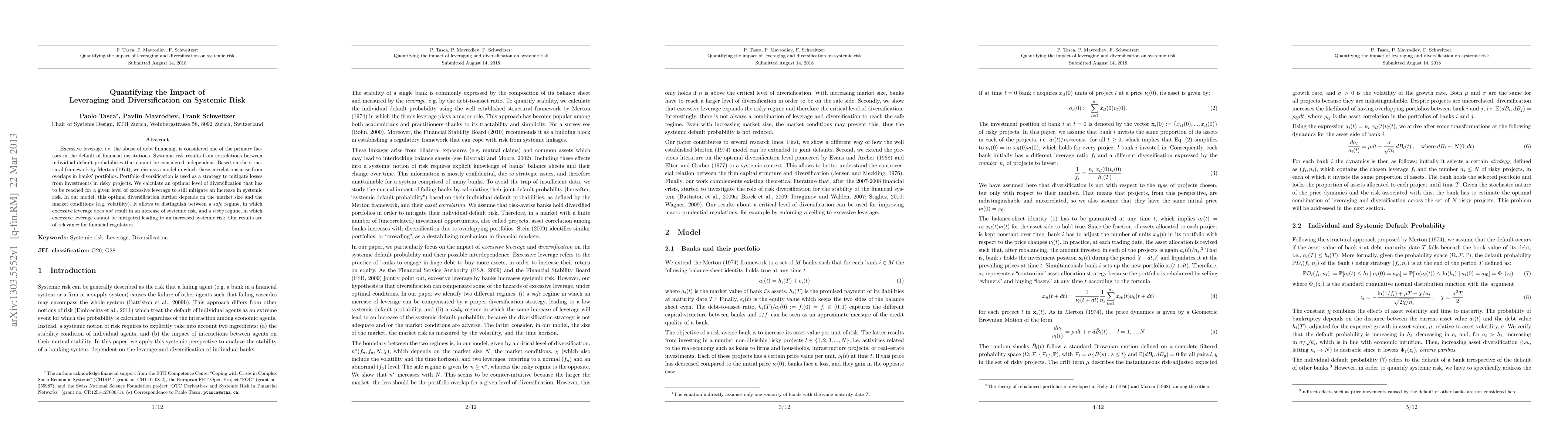 This paper quantifies how excessive leverage and portfolio diversification affect systemic risk, showing that optimal diversification can mitigate the risk of default in interconnected financial institutions. The model identifies conditions under which excessive leverage does not increase systemic risk, providing insights for financial regulators.