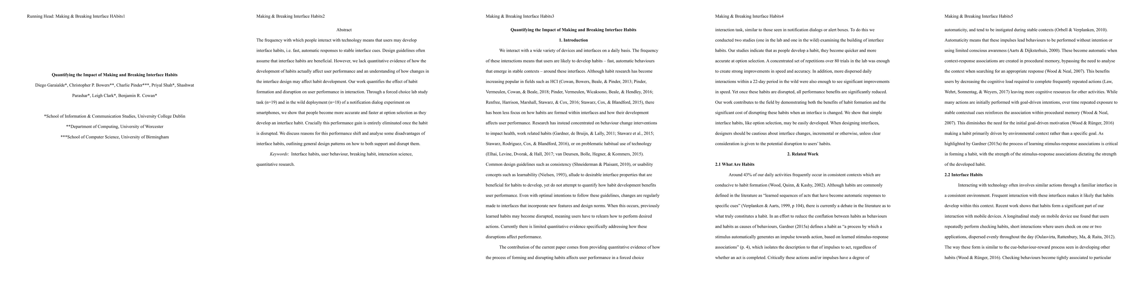 The frequency with which people interact with technology means that users may develop interface habits, i.e. fast, automatic responses to stable interface cues. Design guidelines often assume that interface habits are beneficial. However, we lack quantitative evidence of how the development of habits actually affect user performance and an understanding of how changes in the interface design may affect habit development. Our work quantifies the effect of habit formation and disruption on user performance in interaction. Through a forced choice lab study task (n=19) and in the wild deployment (n=18) of a notificationdialog experiment on smartphones, we show that people become more accurate and faster at option selection as they develop an interface habit. Crucially this performance gain is entirely eliminated once the habit is disrupted. We discuss reasons for this performance shift and analyse some disadvantages of interface habits, outlining general design patterns on how to both support and disrupt them.Keywords: Interface habits, user behaviour, breaking habit, interaction science, quantitative research.