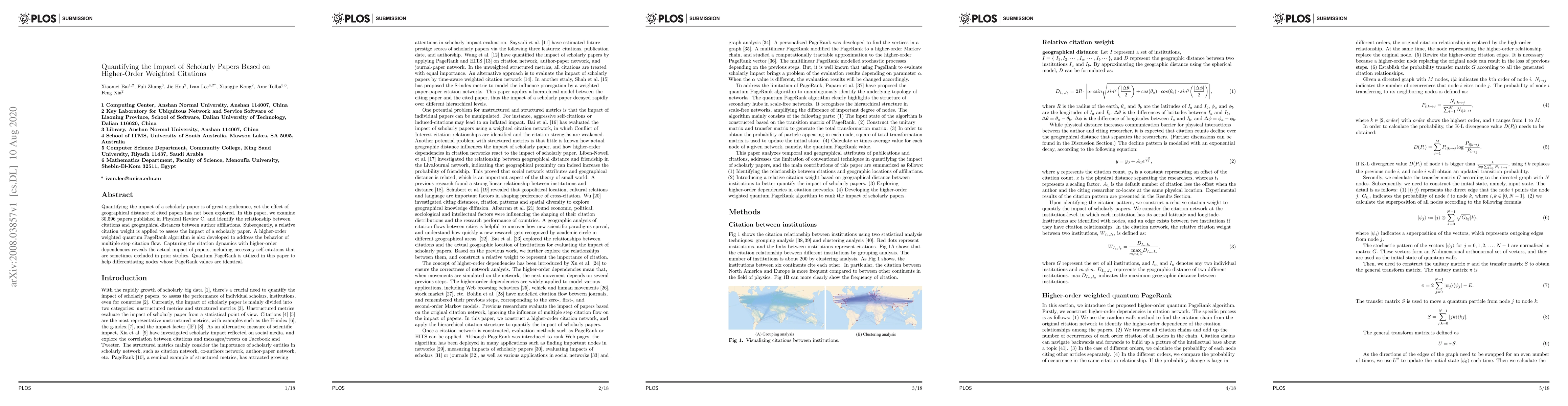 Quantifying the impact of a scholarly paper is of great significance, yet the effect of geographical distance of cited papers has not been explored. In this paper, we examine 30,596 papers published in Physical Review C, and identify the relationship between citations and geographical distances between author affiliations. Subsequently, a relative citation weight is applied to assess the impact of a scholarly paper. A higher-order weighted quantum PageRank algorithm is also developed to address the behavior of multiple step citation flow. Capturing the citation dynamics with higher-order dependencies reveals the actual impact of papers, including necessary self-citations that are sometimes excluded in prior studies. Quantum PageRank is utilized in this paper to help differentiating nodes whose PageRank values are identical.