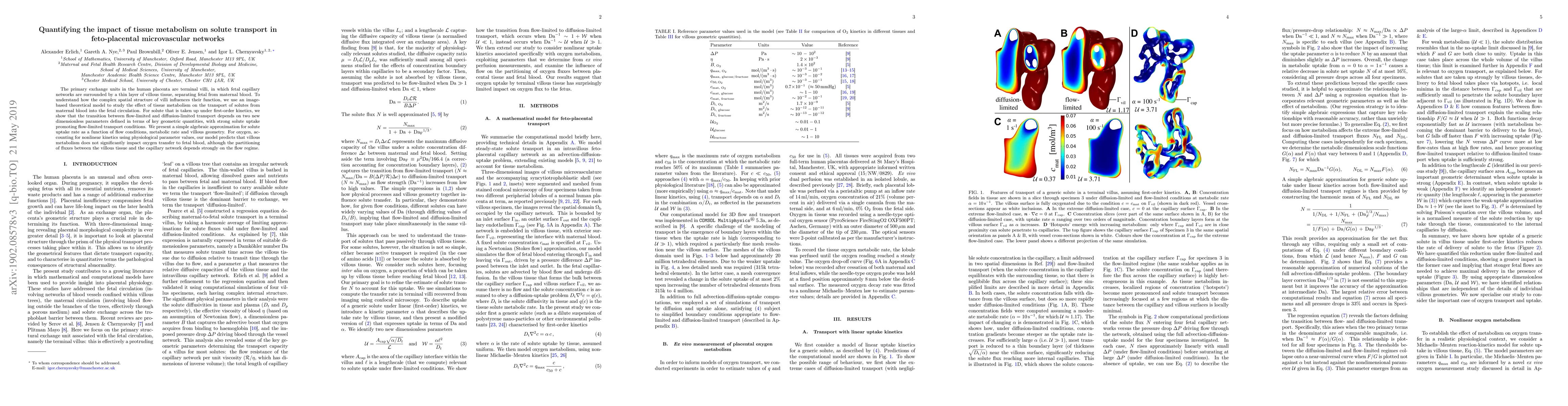Research models the impact of fetal tissue metabolism on solute transport in the placenta, finding that villous geometry and metabolic rate significantly influence solute transfer. The model suggests that villous metabolism has little effect on oxygen transfer but affects flow distribution between tissue and capillary networks.