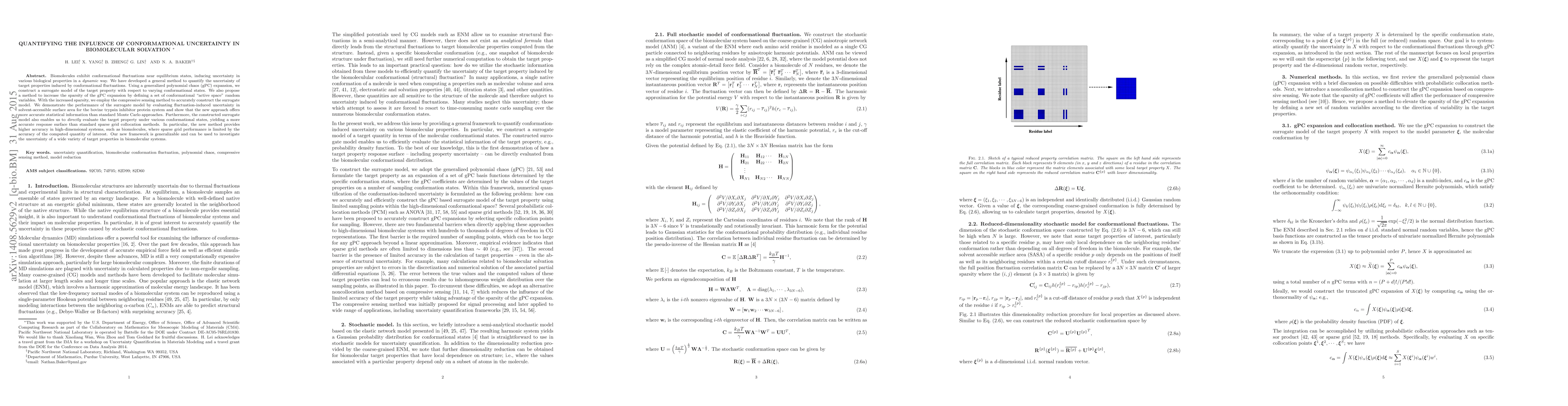 This paper presents a novel method using generalized polynomial chaos expansion and compressive sensing to quantify the uncertainty in biomolecular properties due to conformational fluctuations. The proposed approach provides a more accurate and sparse surrogate model compared to standard Monte Carlo methods, demonstrating improved performance in evaluating solvent-accessible surface area for the bovine trypsin inhibitor protein system.