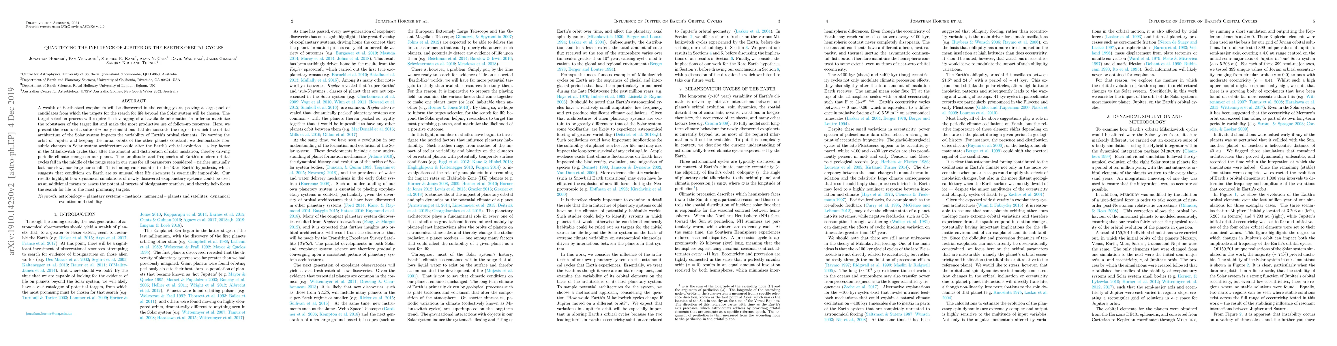A wealth of Earth-sized exoplanets will be discovered in the coming years, proving a large pool of candidates from which the targets for the search for life beyond the Solar system will be chosen. The target selection process will require the leveraging of all available information in order to maximise the robustness of the target list and make the most productive use of follow-up resources. Here, we present the results of a suite of $n$-body simulations that demonstrate the degree to which the orbital architecture of the Solar system impacts the variability of Earth's orbital elements. By varying the orbit of Jupiter and keeping the initial orbits of the other planets constant, we demonstrate how subtle changes in Solar system architecture could alter the Earth's orbital evolution -- a key factor in the Milankovitch cycles that alter the amount and distribution of solar insolation, thereby driving periodic climate change on our planet. The amplitudes and frequencies of Earth's modern orbital cycles fall in the middle of the range seen in our runs for all parameters considered -- neither unusually fast nor slow, nor large nor small. This finding runs counter to the `Rare Earth' hypothesis, which suggests that conditions on Earth are so unusual that life elsewhere is essentially impossible. Our results highlight how dynamical simulations of newly discovered exoplanetary systems could be used as an additional means to assess the potential targets of biosignature searches, and thereby help focus the search for life to the most promising targets.