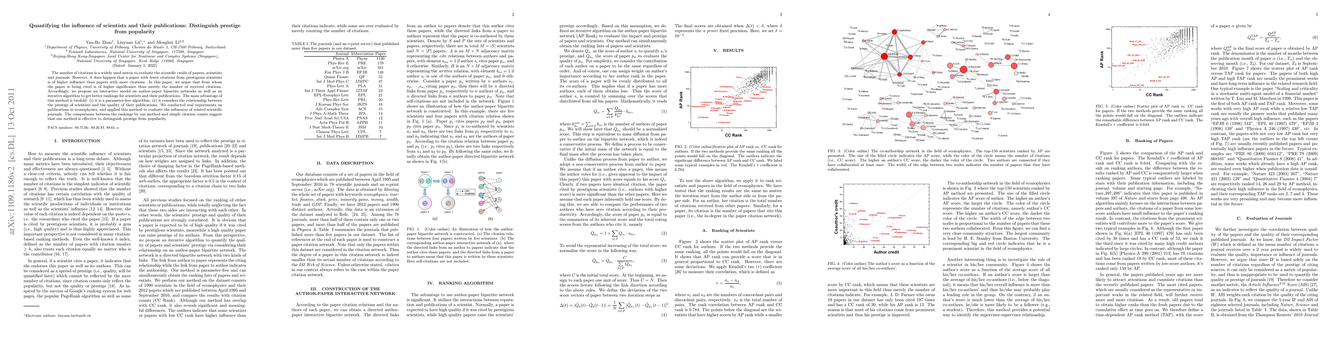 The number of citations is a widely used metric to evaluate the scientific credit of papers, scientists and journals. However, it does happen that a paper with fewer citations from prestigious scientists is of higher influence than papers with more citations. In this paper, we argue that from whom the paper is being cited is of higher significance than merely the number of received citations. Accordingly, we propose an interactive model on author-paper bipartite networks as well as an iterative algorithm to get better rankings for scientists and their publications. The main advantage of this method is twofold: (i) it is a parameter-free algorithm; (ii) it considers the relationship between the prestige of scientists and the quality of their publications. We conducted real experiments on publications in econophysics, and applied this method to evaluate the influences of related scientific journals. The comparisons between the rankings by our method and simple citation counts suggest that our method is effective to distinguish prestige from popularity.